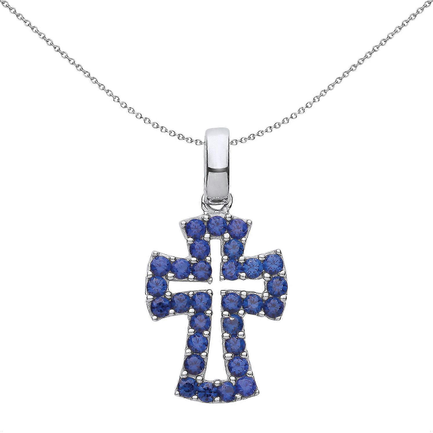 Jewelco London Unisex Rhodium Plated Sterling Silver Blue CZ Graduated Serif Byzantine Cross Pendant Necklace 18 inch