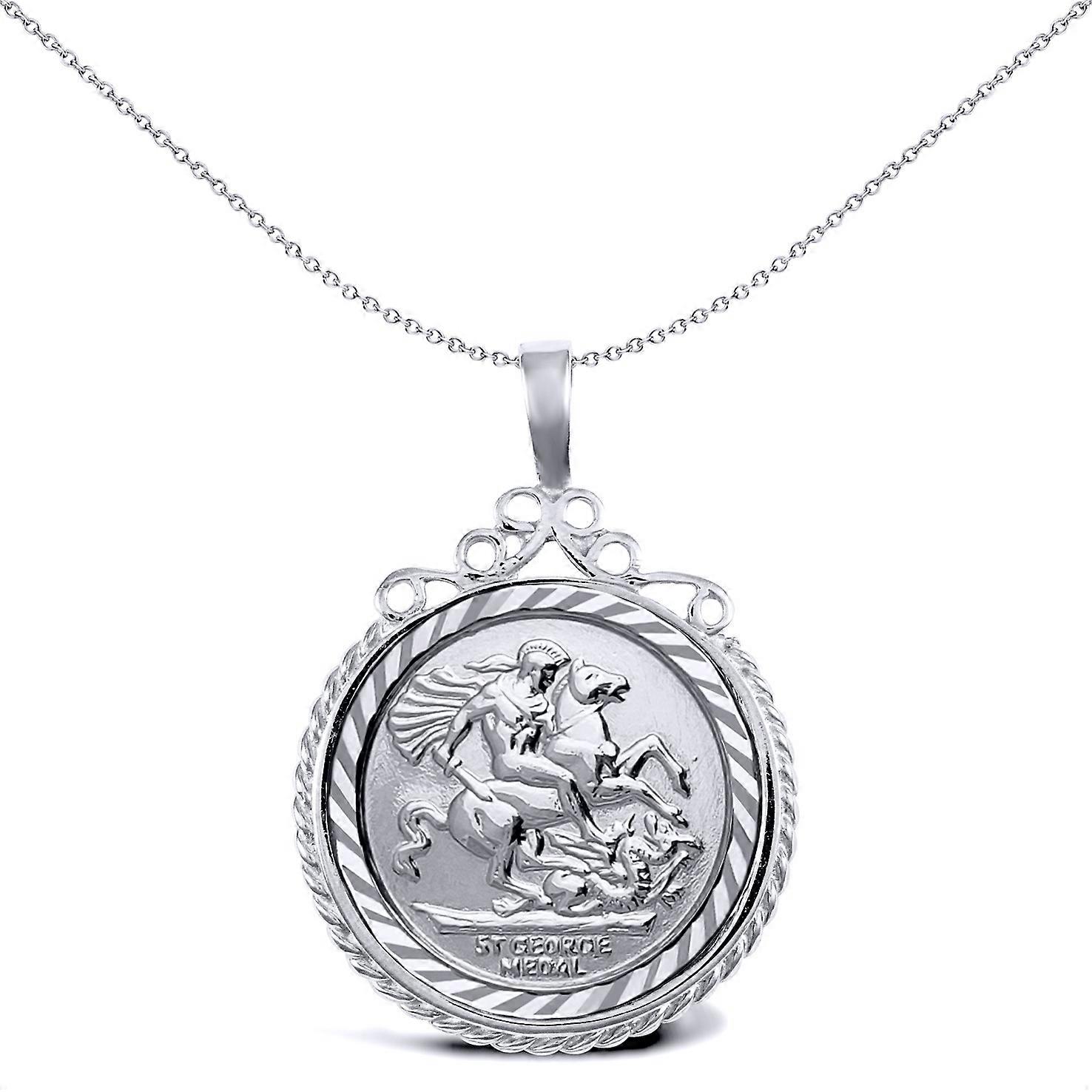 Jewelco London Unisex Rhodium Plated Sterling Silver Rope Edge Scroll Top St George & Dragon Medallion Pendant, (Full Sov Size)