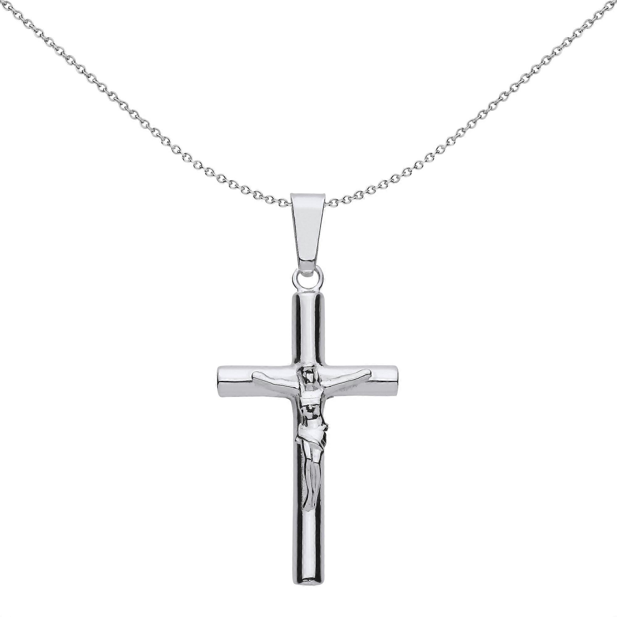 Jewelco London Unisex Rhodium Plated Sterling Silver Round Tube Crucifix Cross Pendant Necklace 18 inch