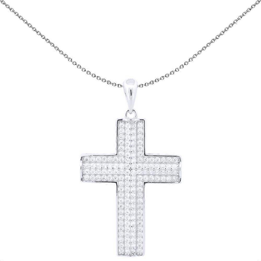 Jewelco London presents this piece from its latest collection of jewellery, a unisex cross pendant made of rhodium plated sterling silver in a encrusted block latin design, set with white round cubic zirconia gemstones. Approx dimensions: Includes a Rhodium-Plated Sterling Silver chain, which can be adjusted to 16, 18 or 20 inches. Height: 36.9mm Length: 20.9mm Weight (excluding chain): 3.8g GEMSTONE: Cubic Zirconia, Round, White, Simulated SKU: APX058