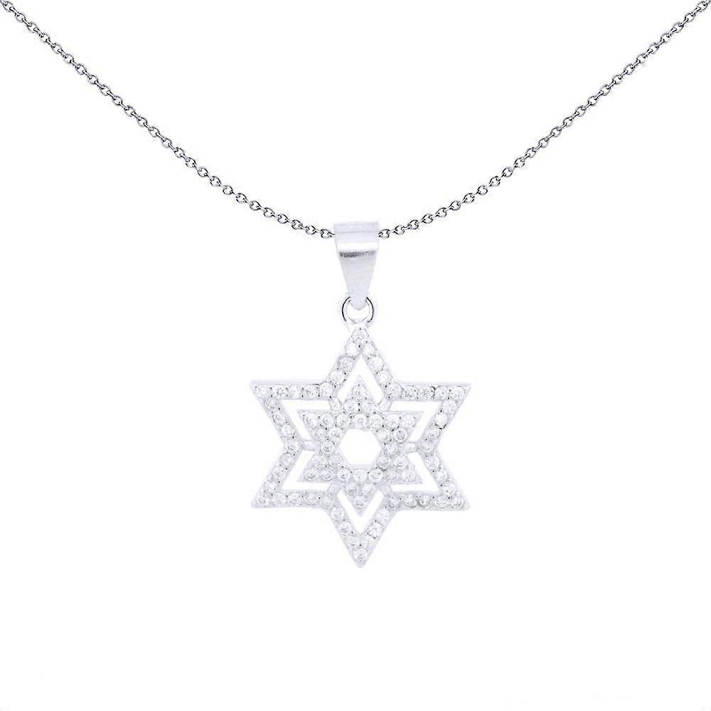 Jewelco London presents this piece from its latest collection of jewellery, a unisex charm pendant made of rhodium plated sterling silver in a magen david double star design, set with white round cubic zirconia gemstones. Approx dimensions: Includes a Rhodium-Plated Sterling Silver chain, which can be adjusted to 16, 18 or 20 inches. Height: 25.2mm (18mm excluding bale) Width: 15.7mm Weight (excluding chain): 2.1g GEMSTONE: Cubic Zirconia, Round, White, Simulated SKU: APD206