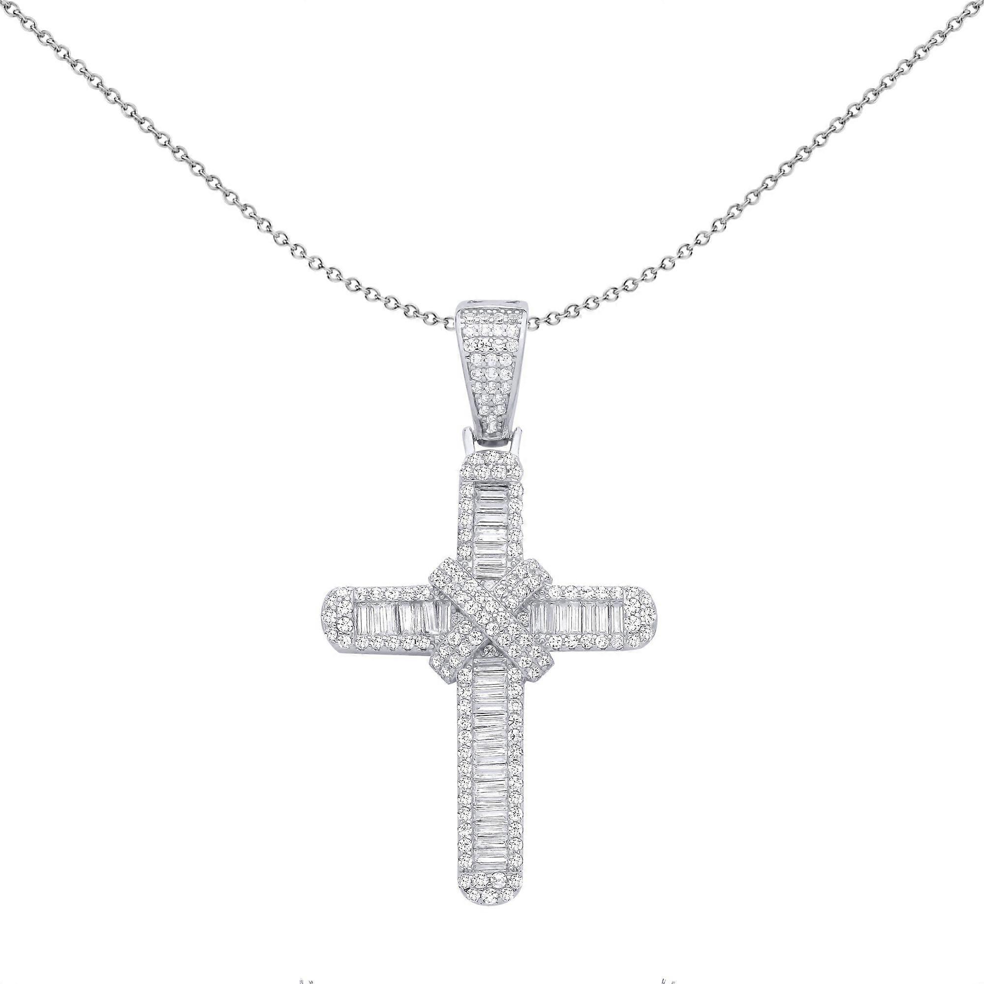 Jewelco London Unisex Rhodium Sterling Silver Baguette CZ Criss Cross Bandolier Cross Pendant Necklace