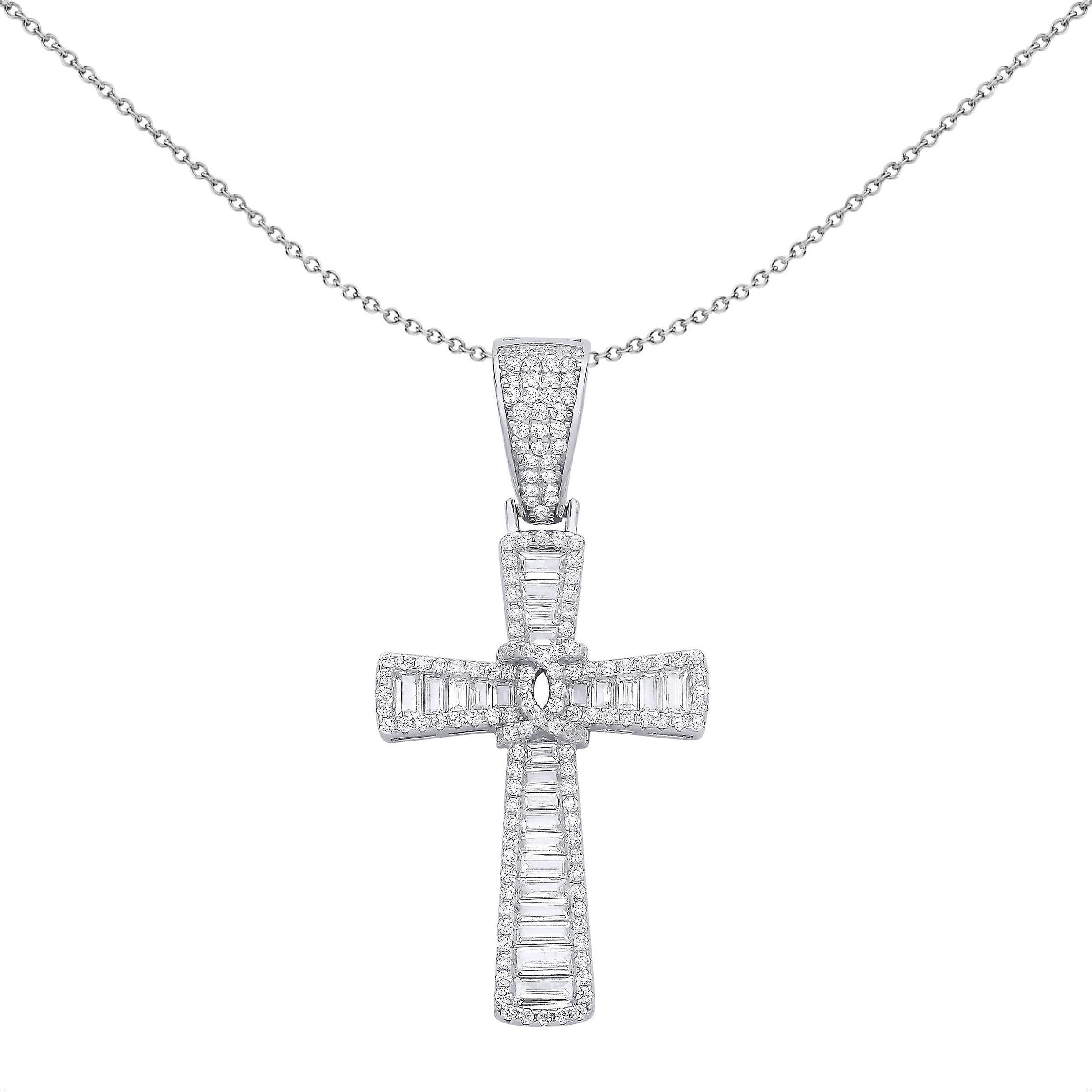 Jewelco London Unisex Rhodium Sterling Silver Baguette CZ Paperclip Knot Sunburst Graduated Cross Pendant Necklace