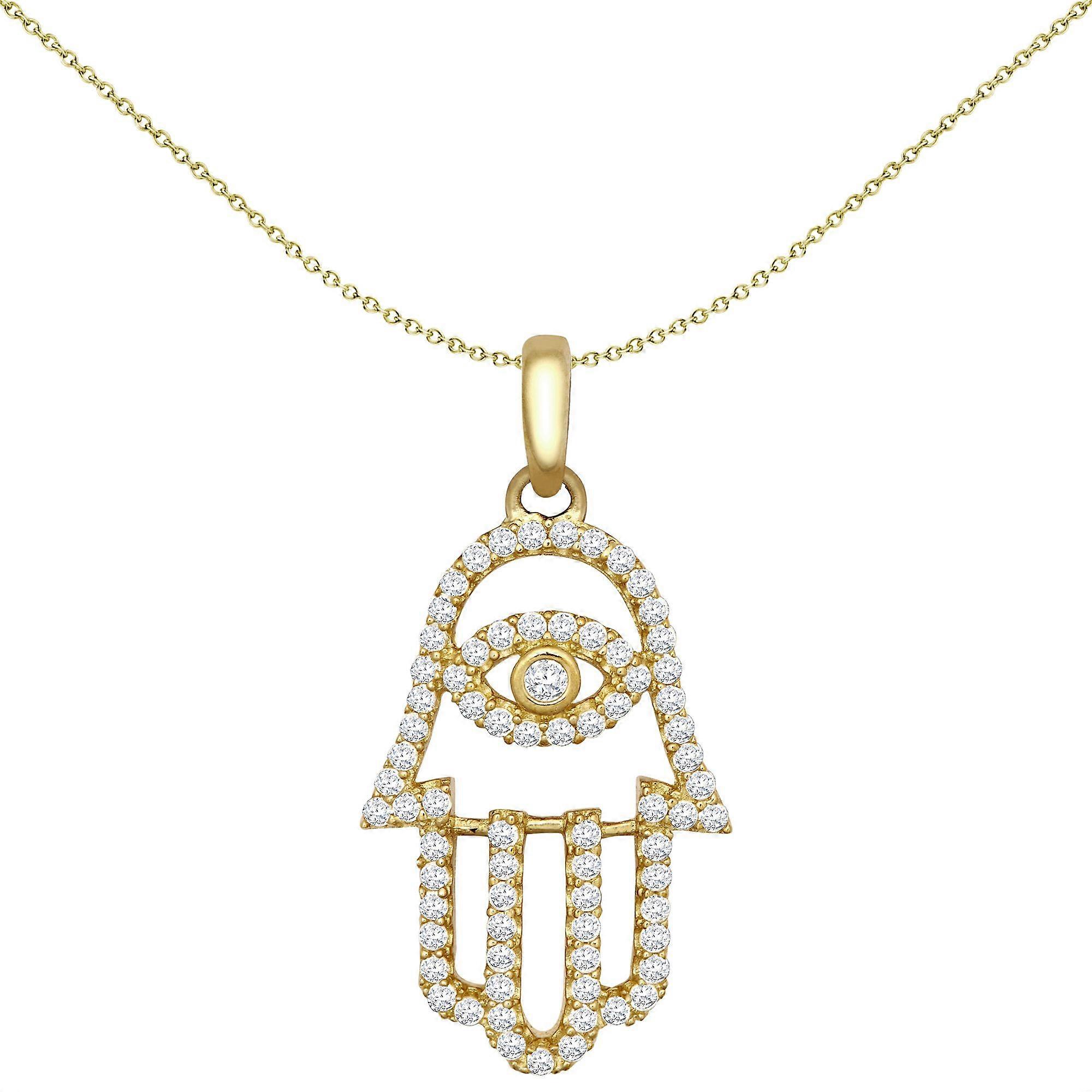 Jewelco London Unisex Solid 9ct Yellow Gold White Round Brilliant Cubic Zirconia Hamsa 5 Hand Charm Pendant