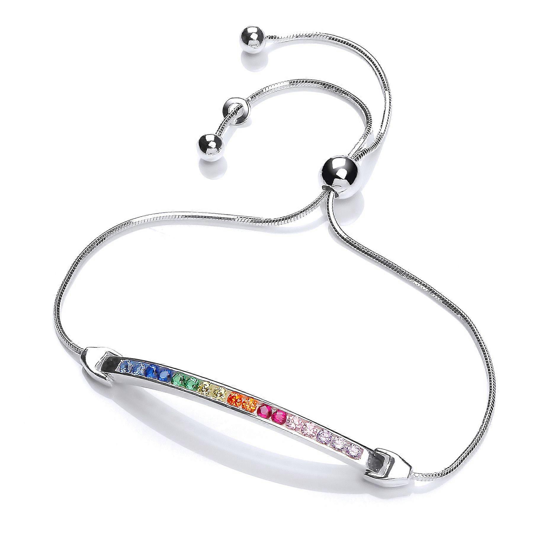 Jewelco London Unisex Sterling Silver Multi Colour CZ Rainbow Adjustable Snake Chain ID Bar Slider Bracelet 2mm 40mm