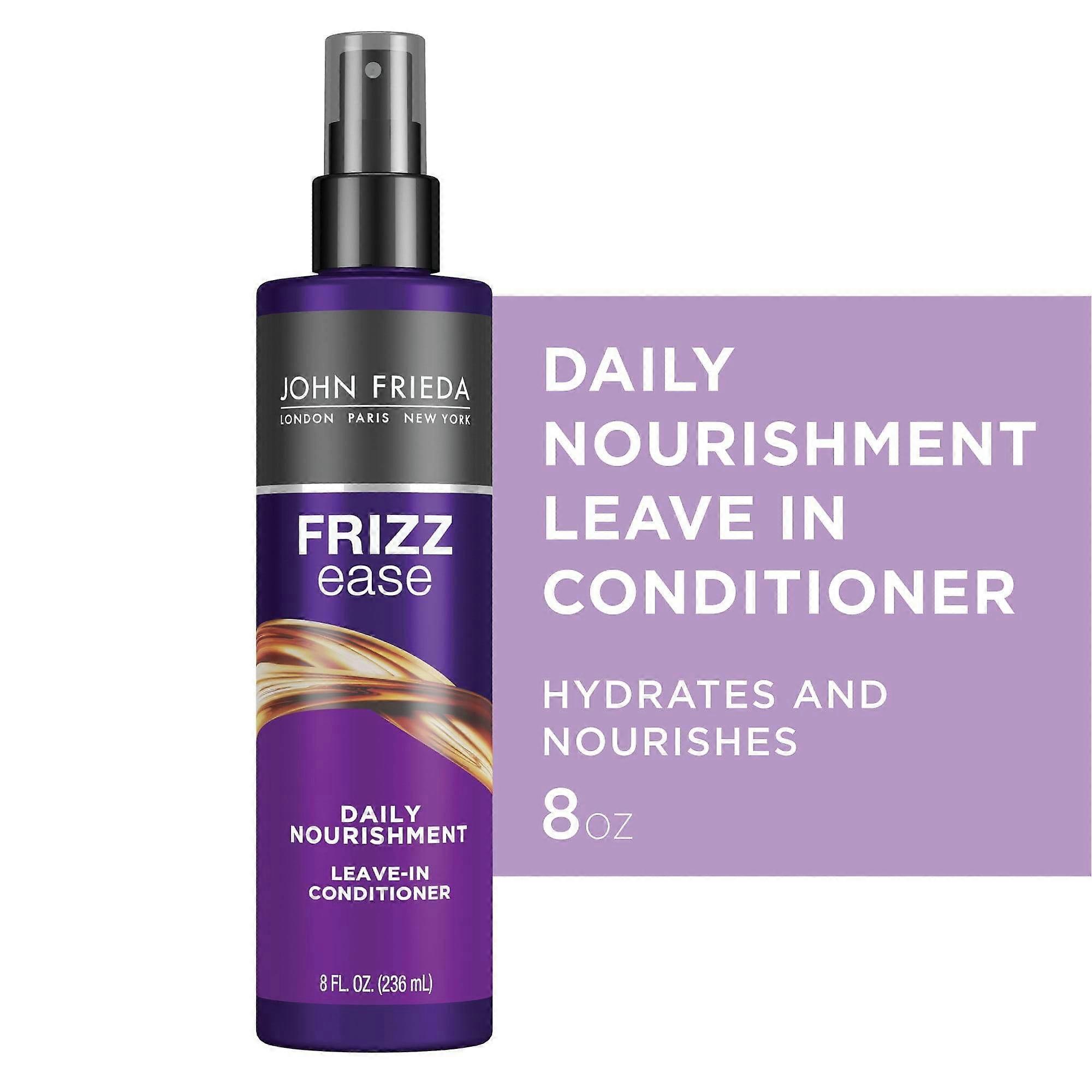 John Frieda Frizz Ease Daily Nourishment Leave-In Conditioner detangles, protects, hydrates, and helps keep hair frizz-free and touchably soft, even before you style it. This moisturizing leave-in spray conditioner is specially formulated with a blend of vitamins as well as green tea extract and hydrating ingredients to nourish dry hair and protect against heat styling and sun damage. Safe for chemically- and color-treated hair, this leave-in hair conditioner can be used daily and layered with other styling anti-frizz products to leave hair smooth, shiny, and frizz-free. Suggested Use: Spray liberally throughout clean, damp hair. Do not rinse out. Safe for color-treated hair. UPC: 717226111655 Weight: 0.88 lbs