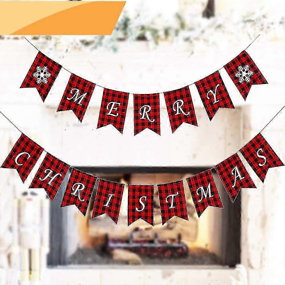 Jolik Merry Christmas Banner With Two Snowflake Flags - Buffalo Plaid Banner Decoration For Fireplace Wall Tree Christmas Decoration