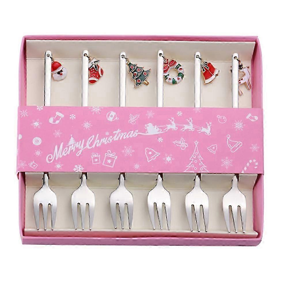 Christmas Coffee Spoons,6 Christmas Fork Silver Christmas Steel Dessert Tea Fork with Christmas Pendants Christmas Tree Elk Hat Bells,Gift Box Packagi
