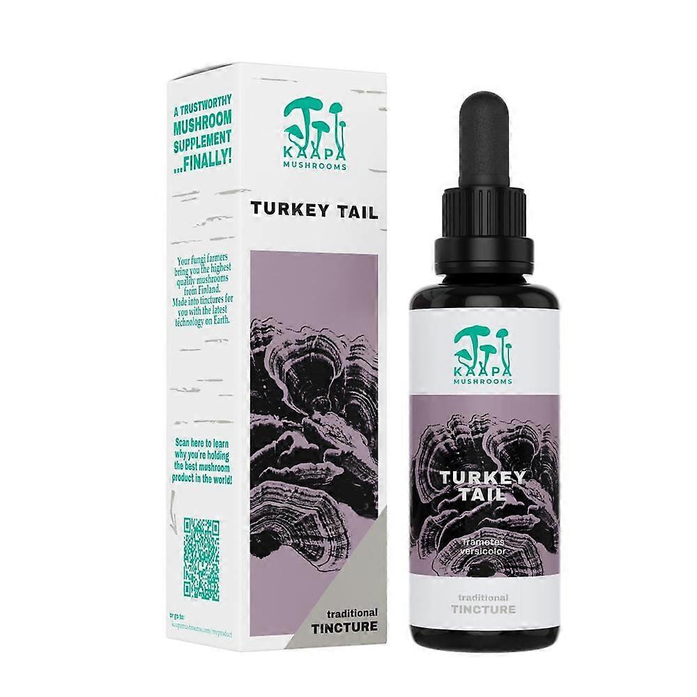 Experience the natural potency of organic Turkey Tail mushrooms with this premium extract tincture from Kaapa Mushrooms. Carefully grown, processed, and packaged in the pristine forests of Finland, our tincture offers a pure and powerful way to support your immune system, reduce inflammation, and promote gut health. The Kaapa Mushroom Difference Our Turkey Tail extract is cultivated on PEFC/FCA certified Finnish birch substrate, ensuring the highest quality source material derived exclusively from mushroom fruiting bodies. This commitment to purity guarantees that every drop contains the vital bioactive compounds you expect from a superior organic mushroom extract. Utilizing industry-leading Ultrasonic Assisted Extraction (UAE) technology, we maximize the bioavailability of key compounds such as triterpenes by effectively breaking down the tough chitin cell walls of the mushrooms. This triple extraction process ensures a potent and effective tincture free from grains, fillers, or additives. Quality, Transparency & Trust At Kaapa Mushrooms, honesty and transparency underpin everything we do. Our innovative transparency project allows you to access batch-specific data on bioactive compounds by scanning the QR code included on each product. This ensures you receive a product that is not only organic but also rigorously tested for potency and purity. 100% Finnish origin Only fruiting bodies used No grains or fillers Triple extraction process Organic certification Batch-specific transparency via QR code Usage Instructions Incorporate the tincture into your daily wellness routine to support gut balance and overall vitality. Start with smaller dosages and gradually increase as needed. The recommended maximum daily dosage is 2ml (equivalent to 2 half pipettes). Take sublingually directly from the pipette for rapid absorption, or blend it into smoothies, water, juice, tea, or coffee according to your preference. For sustained benefits, take a one-week break after every three months of regular use. Important: This product is not intended for use during pregnancy or by children and should be considered a complement to a varied and balanced diet. Support Your Immune System Naturally Harness the transformative power of Finnish-grown Turkey Tail mushrooms with Kaapa Mushrooms' organic tincture. Nourish your body and fortify your immune defenses naturally, one drop at a time.