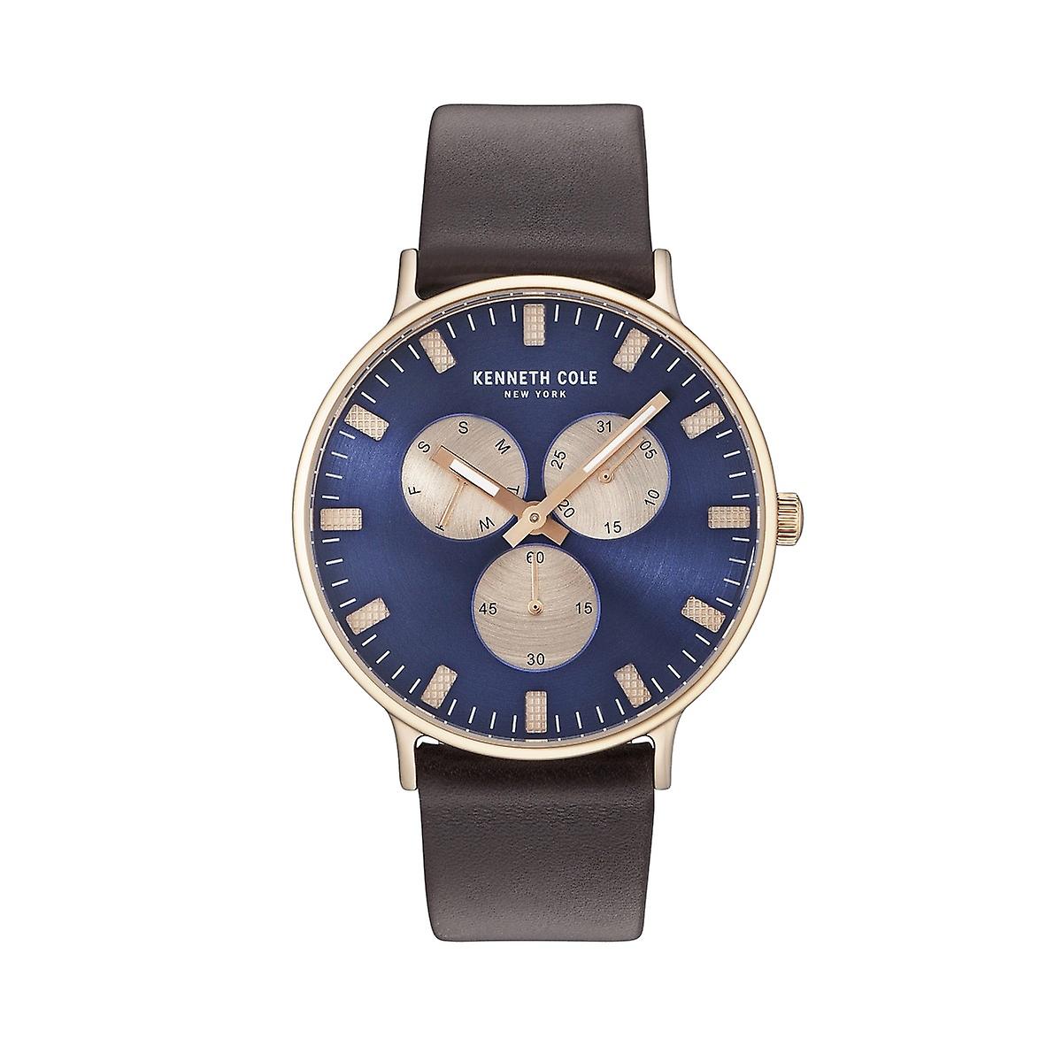 Hersteller:Kenneth Cole ModellNr :KC14946002 Zifferblatt:analog, Farbe: dunkelblau Gehäuse:Roségoldfarbenes Edelstahlgehäuse poliert, Durchmesser ca. 4,1 cm (ohne Krone), Höhe ca. 0,9 cm Gehäuseboden:Edelstahl mit Herstellerlogo Armband:Lederarmband braun, Breite: ca. 2,0 cm Länge der Uhr: ca. 23,5 cm Dornschließe Dichtheit:Wasserdicht 3 ATM (30 m) Funktionen / Anzeigen:Quarzwerk, gehärtetes Mineralglas, Stunden - Minuten - Sekundenanzeige, Datumsanzeige