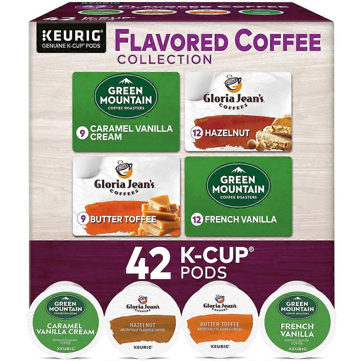Indulge your taste buds with this exciting collection of our favorite flavored coffee varieties Contains: Green Mountain Coffee Caramel Vanilla (12), Gloria Jeans Coffee Hazelnut (9), Gloria Jeans Coffee Butter Toffee (9), Green Mountain Coffee French Vanilla (12). Caffeinated Flavored Coffee Orthodox Union Kosher Compatible with Keurig K-Cup pod single-serve coffee makers