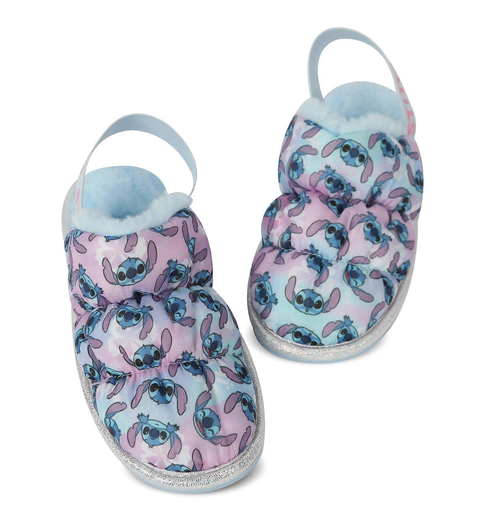 OFFICIALLY LICENSED DISNEY DESIGN:Featuring a fully licensed Disney Lilo and Stitch print, these girls slippers showcase a fun all-over Stitch character design with a branded elastic slingback strap. Perfect for young Disney fans, they add playful charm to everyday wear while ensuring authenticity and quality parents can trust for home comfort and gifting occasions.COSY COMFORT AND WARMTH:Designed for all-day comfort, these slippers include a padded textile upper and ultra-soft, fluffy lining to keep little feet warm and snug. The cushioned footbed offers gentle support, making them ideal for relaxing at home, bedtime routines or chilly mornings while maintaining a lightweight feel for easy movement.SECURE FIT AND EASY WEAR:The elasticated slingback strap helps keep the slippers securely in place while allowing children to slip them on and off independently. This practical design supports confidence and comfort during wear, reducing slipping while walking around the house and making them suitable for everyday indoor use.DURABLE AND SAFE CONSTRUCTION:Finished with a hard-wearing TPR sole, these slippers provide reliable grip on indoor surfaces to help reduce slips and improve stability. Built for active children, the sole offers flexibility and durability while remaining lightweight, supporting safe movement during play and daily activities at home.COLOURFUL GIFT IDEA AND SIZING:Available in UK childrens shoe sizes 8 to 1, these Stitch slippers feature soft pastel tones with a shimmering sole edge for added appeal. A thoughtful gift for birthdays, Christmas or Disney-themed surprises, they combine comfort, style and character magic in one practical footwear choice.