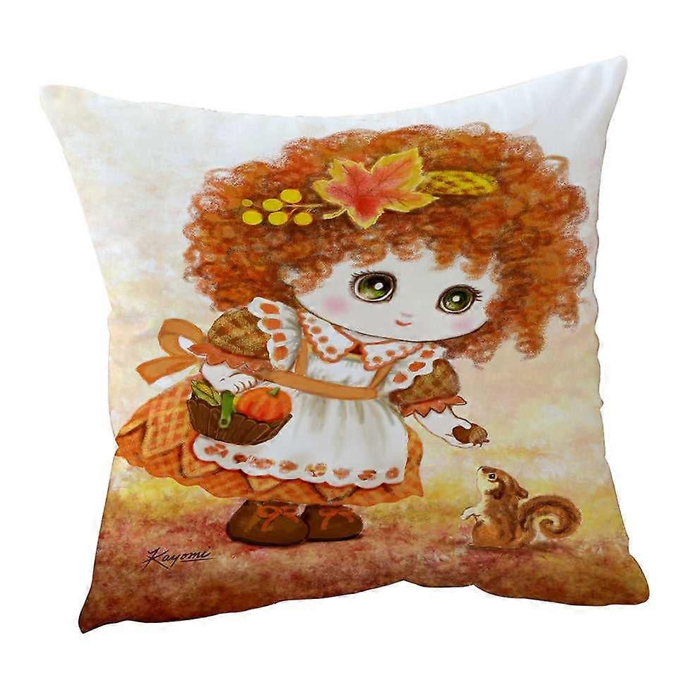 Kids Drawings Autumn Orange Girl and Squirrel Cushion Cover