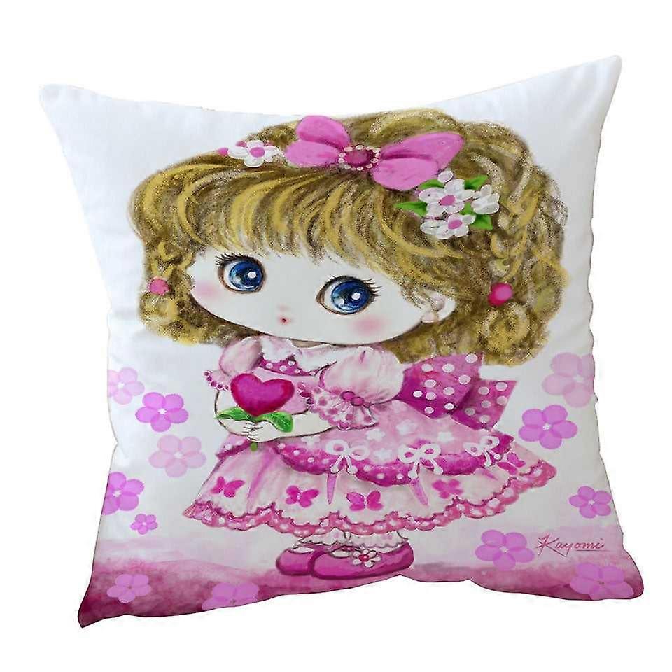 Kids Drawings Pink Girl Heart and Flowers Cushion Cover