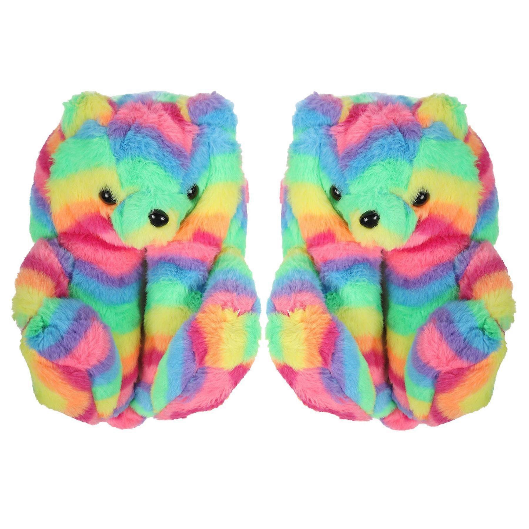 ADORABLE 3D BEAR DESIGN:Fun rainbow coloured bear slippers with a detailed 3D face and plush ears bring joy to every step. Perfect for adding a playful touch at home, lounging, or sleepovers, these slippers brighten up your day while keeping feet snug, making them an ideal gift for kids and women who love cute animal designs.COSY & PLUSH MATERIAL:Made from ultra-soft polyester, these slippers deliver maximum warmth and comfort. The fluffy lining wraps feet in softness, ensuring cosy wear on cold mornings and chilly evenings. Lightweight yet snug, they keep toes warm while letting feet breathe, making them the perfect indoor footwear for all seasons.FUNCTIONAL & SAFE SOLE:Designed with a textile sole featuring anti-slip dots, these slippers provide safe and secure steps on smooth floors. Whether walking on tiles, wooden flooring, or carpets, the grip helps reduce slips while maintaining flexibility, making them practical and safe for everyday wear around the home.VIBRANT RAINBOW STYLE:With a striking rainbow colour print, these slippers add fun and personality to your indoor wear. Bright multicoloured stripes make them eye-catching and cheerful, appealing to children and women alike. The playful bear face and lively colours make these slippers both stylish and entertaining to wear.PERFECT GIFT IDEA:Available in a wide size range for kids and women, these slippers make an excellent present for birthdays, Christmas, or special occasions. The combination of soft plush design, comfort, and rainbow style ensures they’re a thoughtful and fun gift choice for family and friends who love cosy animal slippers.