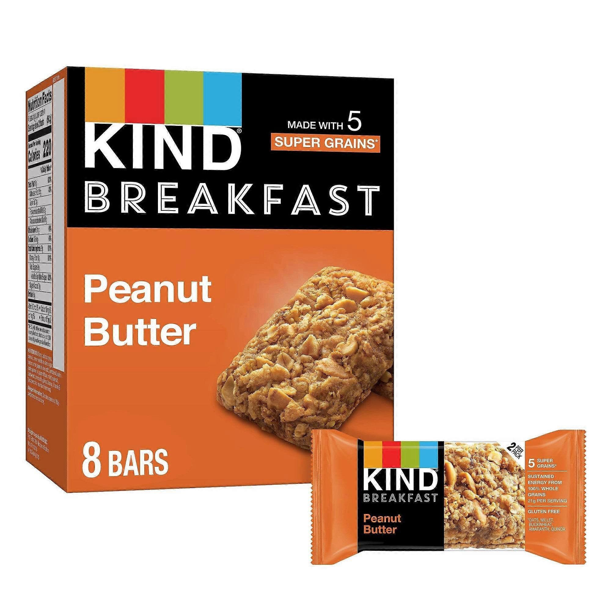 KIND Breakfast Peanut Butter bars are a wholesome, healthy snack made with 100% whole grains for sustained energy. KIND Peanut Butter breakfast bars are made with five super grains—oats, buckwheat, millet, amaranth and quinoa—and baked with peanuts and peanut butter for a chewy, soft baked addition to your breakfast. These KIND bars come in individually wrapped two bar packs that are perfect for convenient, on-the-go gluten free snacks. Each two bar pack has at least one full serving of whole grains. KIND Breakfast bars help provide sustained energy whether you need a nutritious snack for your lunchbox or nutrition bars to grab on your way out the door. Made with quality, wholesome ingredients, these gluten free breakfast bars contain 20 grams of whole grains per serving and 0 grams of trans fat. These healthy snacks are also dairy free and made without genetically engineered ingredients. UPC: 602652201059 Weight: 0.82 lbs
