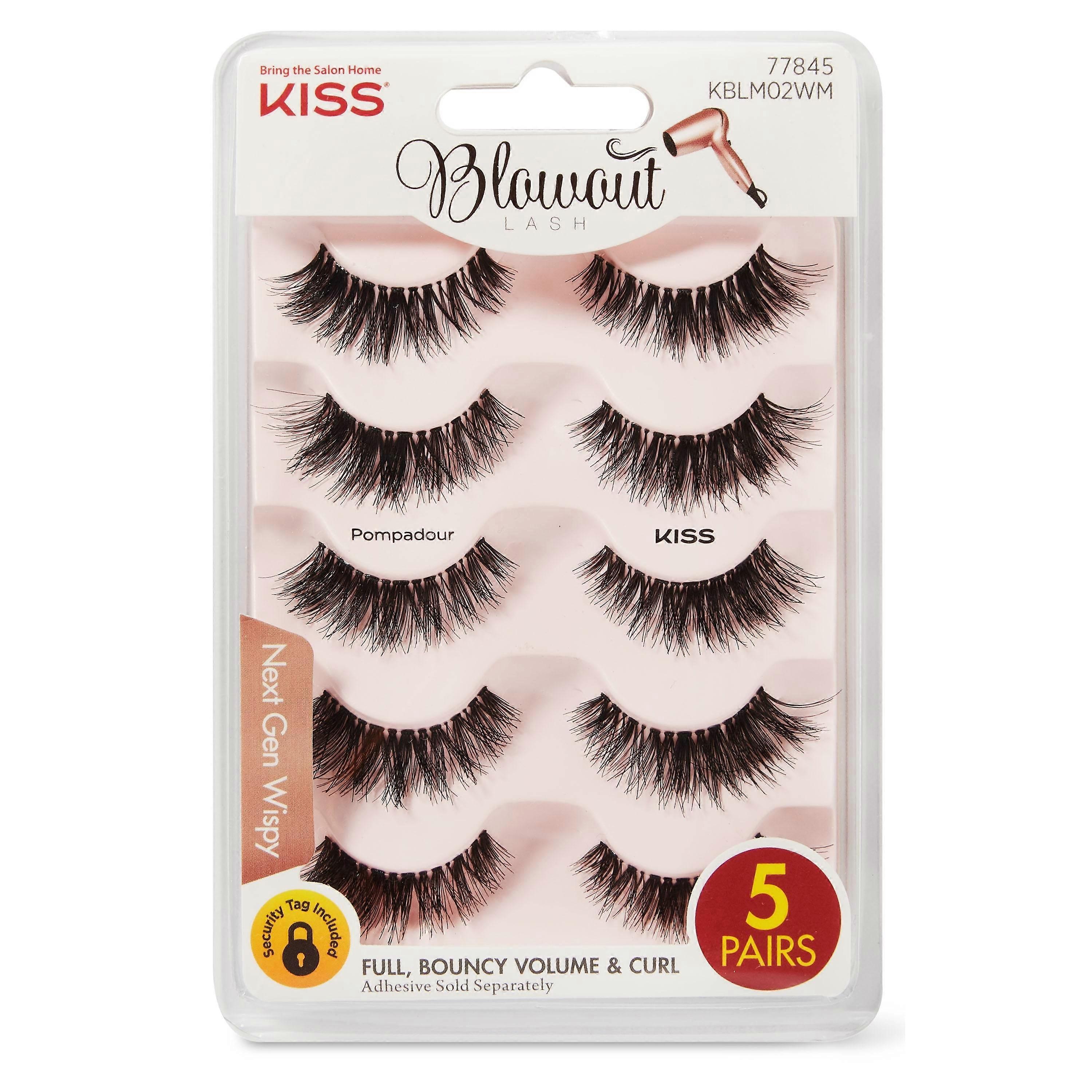 KISS Blowout Lash Multipack, Pageboy - Next-Gen Wispy. Define your eyes with a fanned out flash of flirty. The latest in falsies, known as "Next-Gen Wispy". Salon styled technology gives full, bouncy volume & curl Pompadour style creates bold definition with extra length, volume and a slightly denser lash POMPADOUR creates bold definition with extra length volume & a slightly denser lash  Value-priced 5-pair multipack  USE & TIPS Lay on top of your natural lash to check fit. If strip extends beyond your lash line, trim from the outer edge by cutting in between knots for your best fit. Apply KISS Strip Lash Adhesive to the lash band; wait 30 seconds for adhesive to become slightly tacky. Apply lash along natural lash line, tapping into place. Hold as adhesive fully dries. UPC: 731509778458 Weight: 0.38 lbs