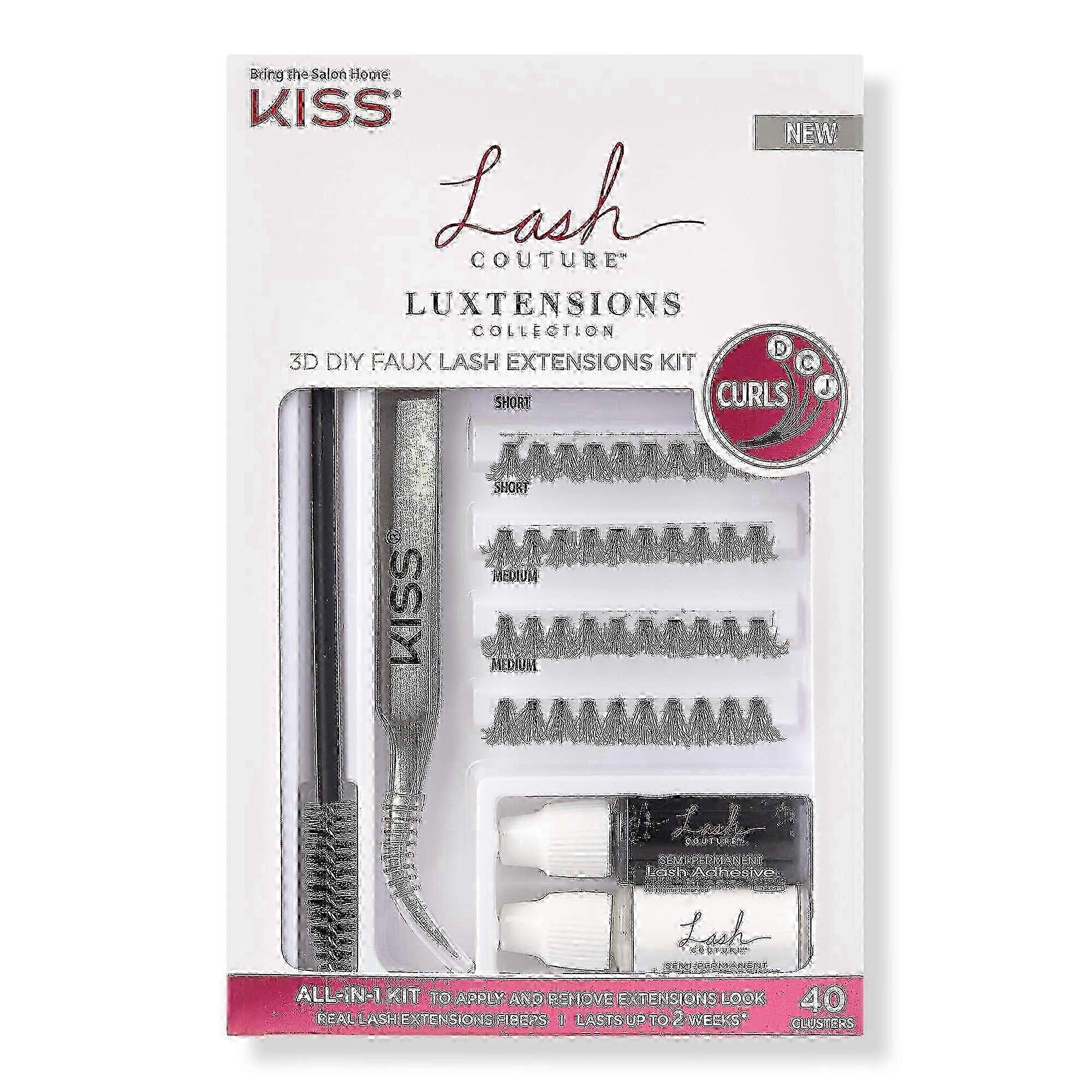 KISS Lash Couture Luxtensions 3D DIY Faux Lash Extension Kit is an all-in-1 Kit for an easy lash extensions look with semi-Permanent Adhesive. Lashes stay on for up to 2 weeks-like real extensions Features All-In-1 Kit for easy to achieve lash extensions lookFlat roots and tapered ends mimic actual lashesSemi-Permanent Adhesive-lashes stay on for up to 2 weeks - like real extensions Faux Lash Extensions Kit with individual lash clustersAll you need for a True Lash Extensions Effect40 last clusters, each holds 20 lash strandsEasier, Faster Application with Pro Results Includes Clusters (40 ct)Semi-Permanent Lash Adhesive (0.07oz)Semi-Permanent Lash Adhesive Remover (0.07oz)Precision WweezersSpoolie Inactive Ingredients: Alcohol Denat., Nitrocellulose, Methoxyisopropyl Acetate, Citric Acid, Sorbitol, Ceteareth-25, Sodium Carbonate, Black 2 Semi-permanent lash adhesive remover: Butyrolactone, Water, Bentonite, 1,2-Hexanediol, Phenoxyethanol, Aluminum Hydroxide, Ammonium Polyacrylate, Butylene Glycol, Titanium Dioxide. Suggested Use: 1. Using tweezers, gently grip the band of one cluster and lift off of tray2. Dip the band portion into lash adhesive; do not saturate. (both strip lash adhesive and individual lash adhesive can be used)3. Starting from outer corner of eye, place the band as close to your natural lash line as possible. Repeat with additional lash clusters, until you achieve desired effect.How to Remove:1. One eye at a time, place a tissue or a cotton pad over the lower lid and partially close your eye2. Saturate a cotton swab with KISS Semi-Permanent Lash Adhesive Remover, and gently stroke along the lash line until adhesive softens3. Gently remove lash without pulling; repeat if necessaryKeep out of the reach of children. Product Packaging: Please note that some manufacturer may often change their packaging. This product may arrive different from what is pictured. We will always ship the most up-to-date packaging to our customers. Please contact us if you have any questions about this product or would like to request an older version of this product. UPC: 000002559005 Weight: 0.07 lbs