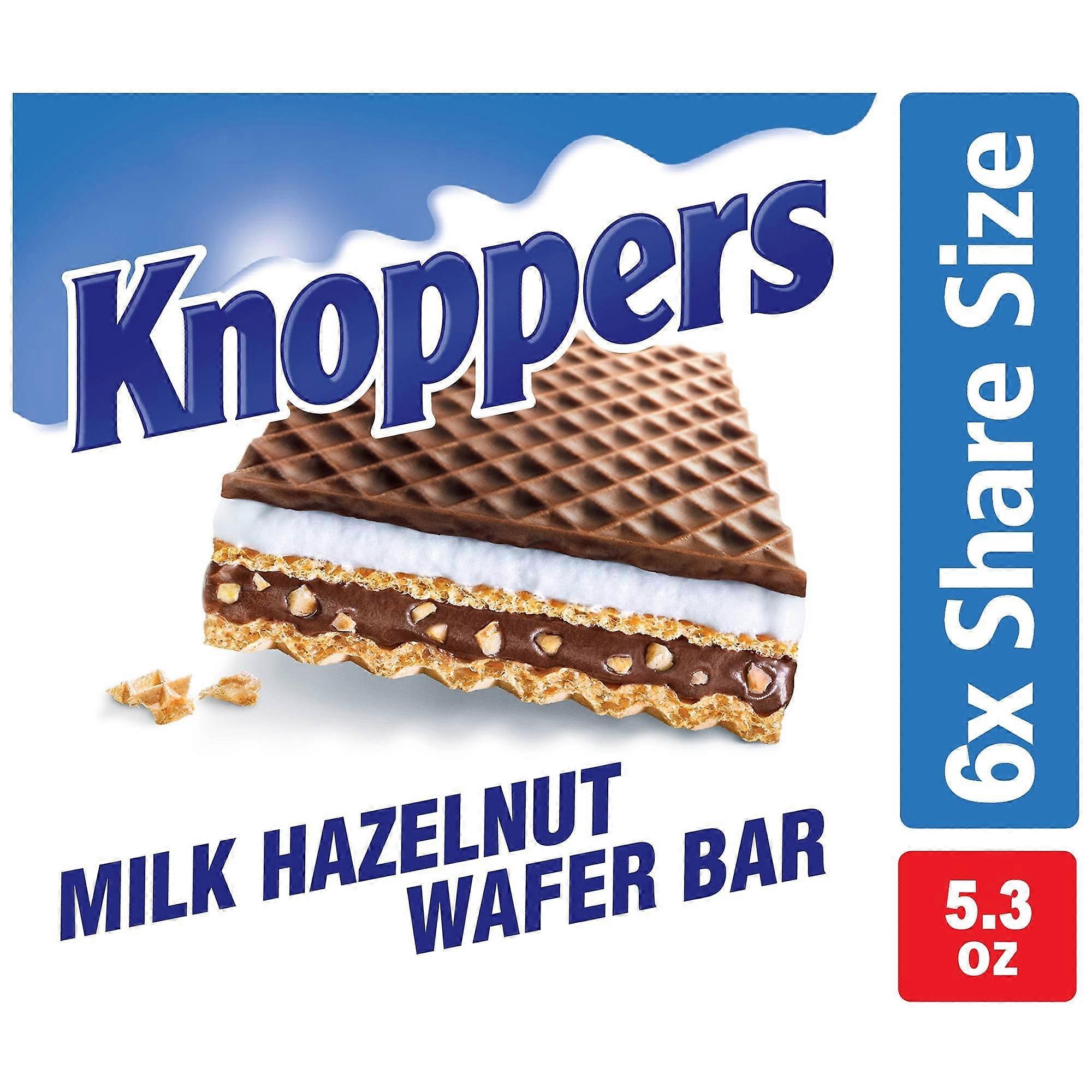 Knoppers, the crispy and tasty wafer candy that brings layers of flavor into every bite. Made up of five delicious layers of crispy baked wafers, milk crème, creamy hazelnut filling, and crunch roasted hazelnut pieces, topped with a touch of cocoa The classic Knoppers wafer candy. One 6 piece pack of Knoppers Wafer bars.One 6 piece pack of Knoppers Wafer bars. Individually wrapped snack-size bars that are perfect for a personal snack or sharing. Find Knoppers in the candy aisle. Always have a snack on hand with Knoppers Contains peanuts and tree nuts.