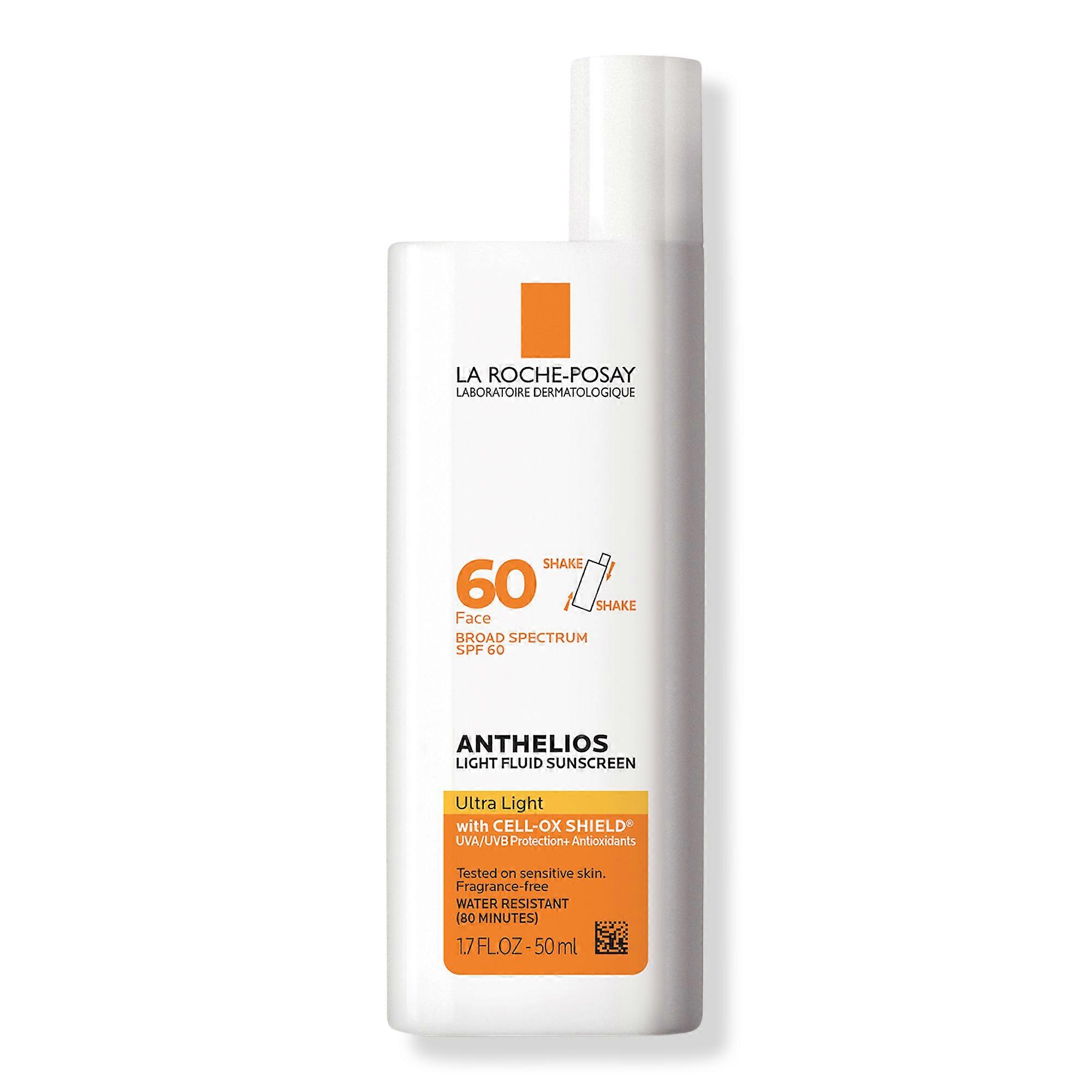 La Roche-Posay Anthelios Light Fluid Face Sunscreen SPF 60 is an ultra-lightweight formula with broad-spectrum UV and antioxidant protection for combination skin. Oil-free face sunscreen provides broad-spectrum SPF 60 protection Lightweight, non-whitening, fast-absorbing, fluid sunscreen texture leaves skin with a matte finish Helps reduce the appearance of sun damage Provides a smooth base for makeup Powerful antioxidant complex helps protect skin from free radicals caused by UV rays Soothes the skin with mineral-rich La-Roche Posay Thermal Spring Water Water-resistant for up to 80 minutes Ideal for all skin types, especially normal to combination skin Non-comedogenic Fragrance Free Oil Free Paraben Free Formulated and rigorously tested for skin tolerance, even on sensitive skin Allergy tested Dermatologist tested for safety Ingredients Cell-Ox Shield technology combines broad-spectrum UVA/UVB filters and powerful antioxidant protection La Roche-Posay Thermal Spring Water is naturally rich in minerals with scientifically demonstrated soothing and antioxidant properties Suggested Use Can be used alone or under makeup If used with other skincare products, use as a last step in regimen Shake well before use Apply generous amount 15 minutes before sun exposure Reapply at least every 2 hours after swimming or sweating Reapply immediately after towel drying For a complete skin care regimen: Cleanse with Toleriane Hydrating Gentle Facial Cleanser Moisturize with Toleriane Double Repair Moisturizer Protect with Anthelios Light Fluid Face Sunscreen