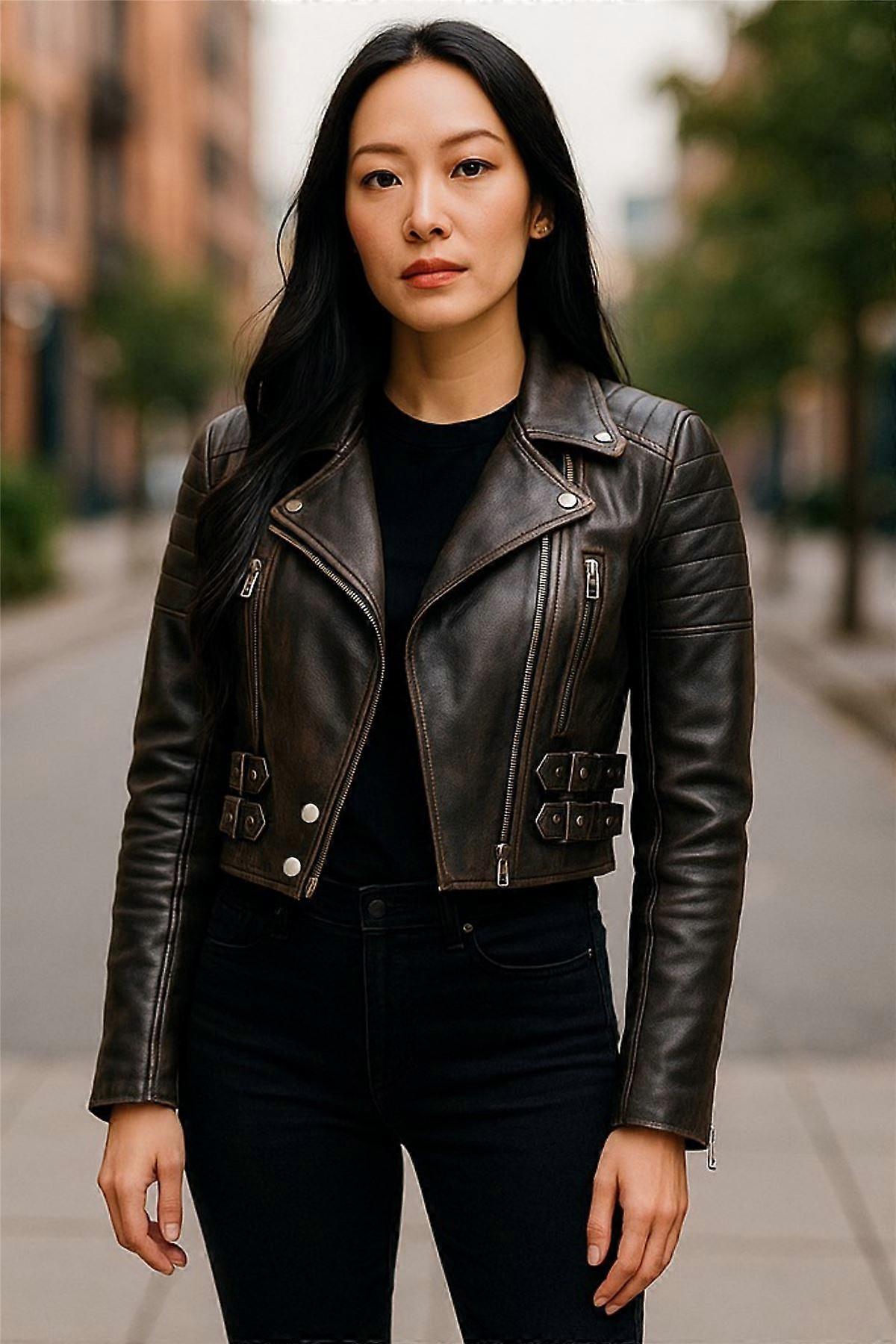 Ladies Cropped Jacket Short Body Gothic Top Vintage Black Chic Biker Real Leather Jacket