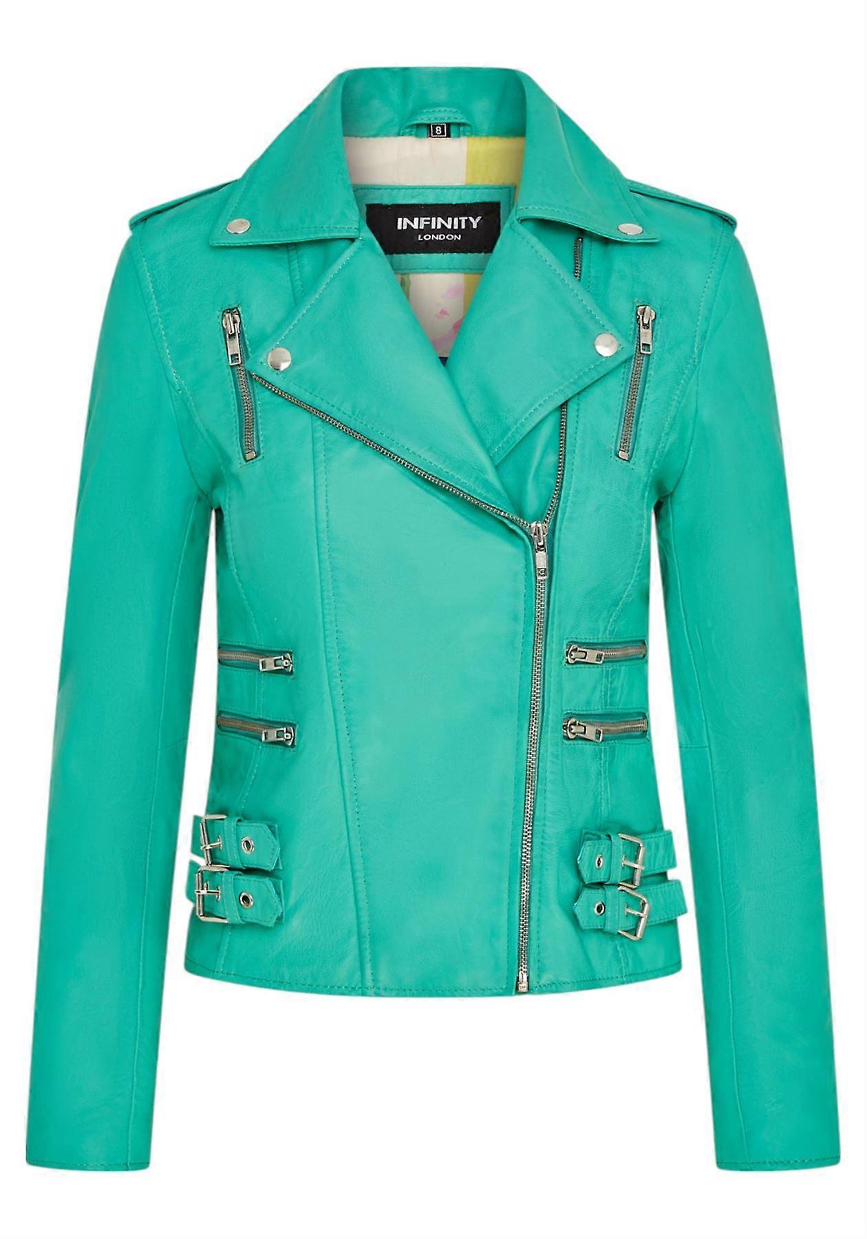 Ladies Leather Biker Jacket Aqua Blue Real Lamb Nappa Vintage Gothic Buckle Jacket