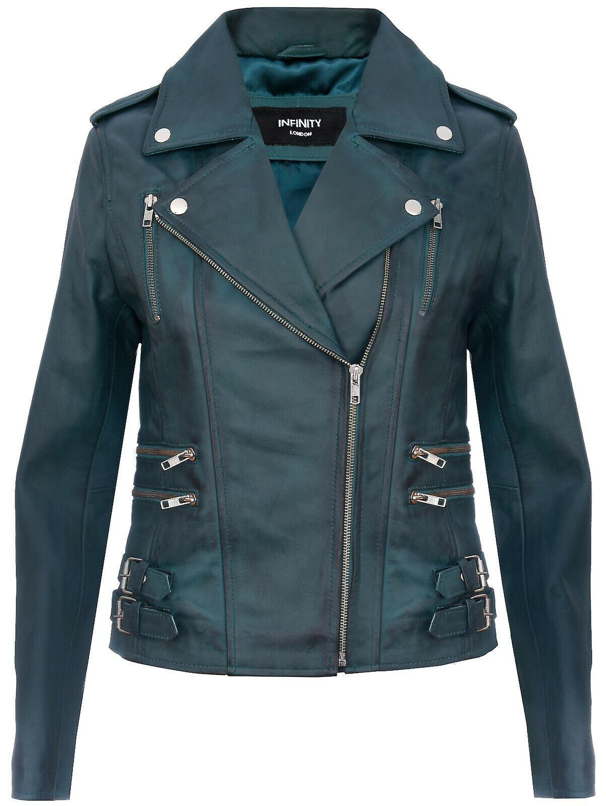 Ladies Leather Biker Jacket Teal Blue Real Lamb Nappa Vintage Gothic Buckle Jacket