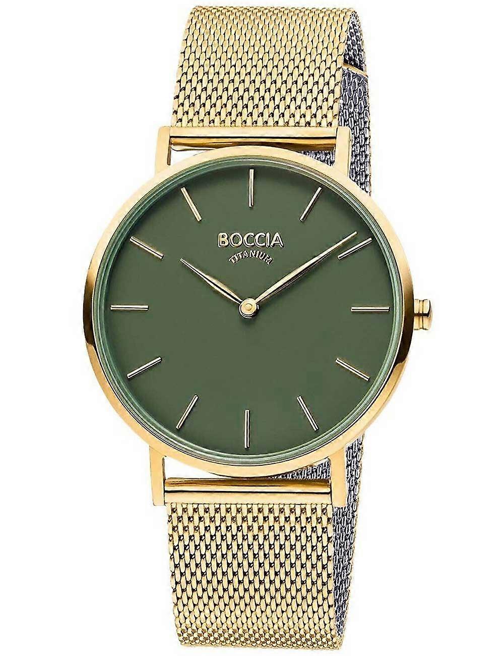Model: Ladies Watch Boccia 3273-12, Quartz, 36mm, 3ATM. Brand: Boccia. Package Weight: 0.5 kg. Movement: Quartz. Case Color: Green. Watchband Color: Gold. Watchband Material: Steel. Case width: 36 mm.