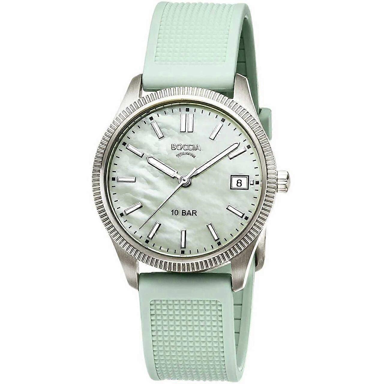 Model: Ladies Watch Boccia 3356-02, Quartz, 35mm, 10ATM. Brand: Boccia. Package Weight: 0.5 kg. Movement: Quartz. Case Color: Green. Watchband Color: Green. Watchband Material: Silicone. Case width: 35 mm.