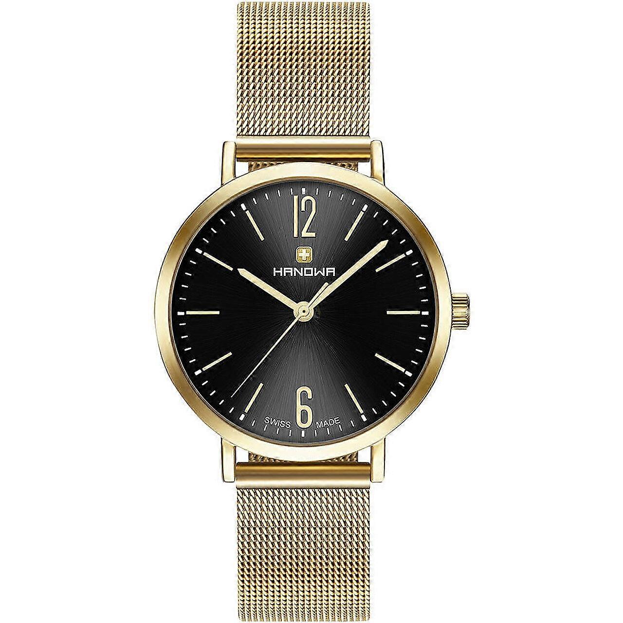 Model: Ladies Watch Hanowa 16-9077.02.007, Quartz, 36mm, 3ATM. Brand: Hanowa. Package Weight: 0.5 kg. Movement: Quartz. Case Color: Black. Watchband Color: Gold. Watchband Material: Steel. Case width: 36 mm.