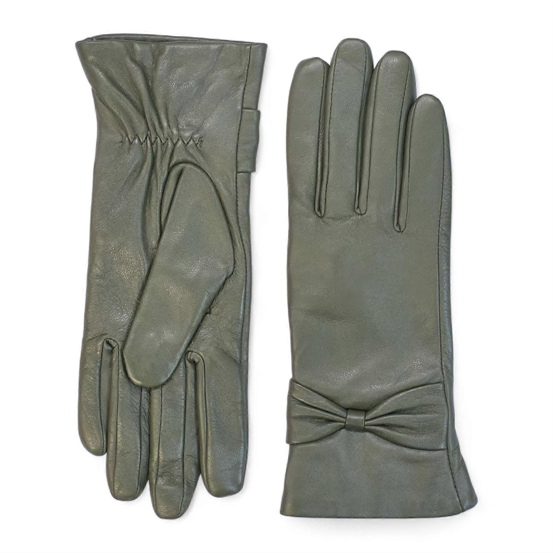 Ladies Womens Olive Green Italian Leather Soft Wool Lining Winter Bow Design Driving Gloves