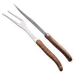 Technical Specifications: • Knife dimensions: Total length: 29 cm blade thickness: 2.5 cm • Fork dimensions: Total length: 26 cm two-pronged fork • Handle: olive wood • Box: Varnished oak box made in France • Origin: 100% made in France delivered with a certificate of origin This olive wood carving set is the perfect gift for those who appreciate beautiful objects and quality cooking. Whether for a wedding birthday or special occasion this set combines utility with refinement. With its varnished oak box and french artisanal craftsmanship it is sure to delight even the most discerning individuals. Find out more : The laguiole chopping set with olive wood handle is a refined functional set designed for lovers of fine food and quality products. Each piece features a solid handle made from olive wood a material that is both solid and aesthetically pleasing renowned for its unique grain and durability. Olive wood is light and pleasant to the touch with a beautiful finish and a comfortable grip. The set comes in an elegant varnished oak wood box which protects the knives while adding a touch of sophistication to the overall look. The case with its smooth glossy finish enhances the knives and makes them easy to store while decorating the table or kitchen. This laguiole chopping set combines tradition and luxury perfect for refined meals and moments of sharing.