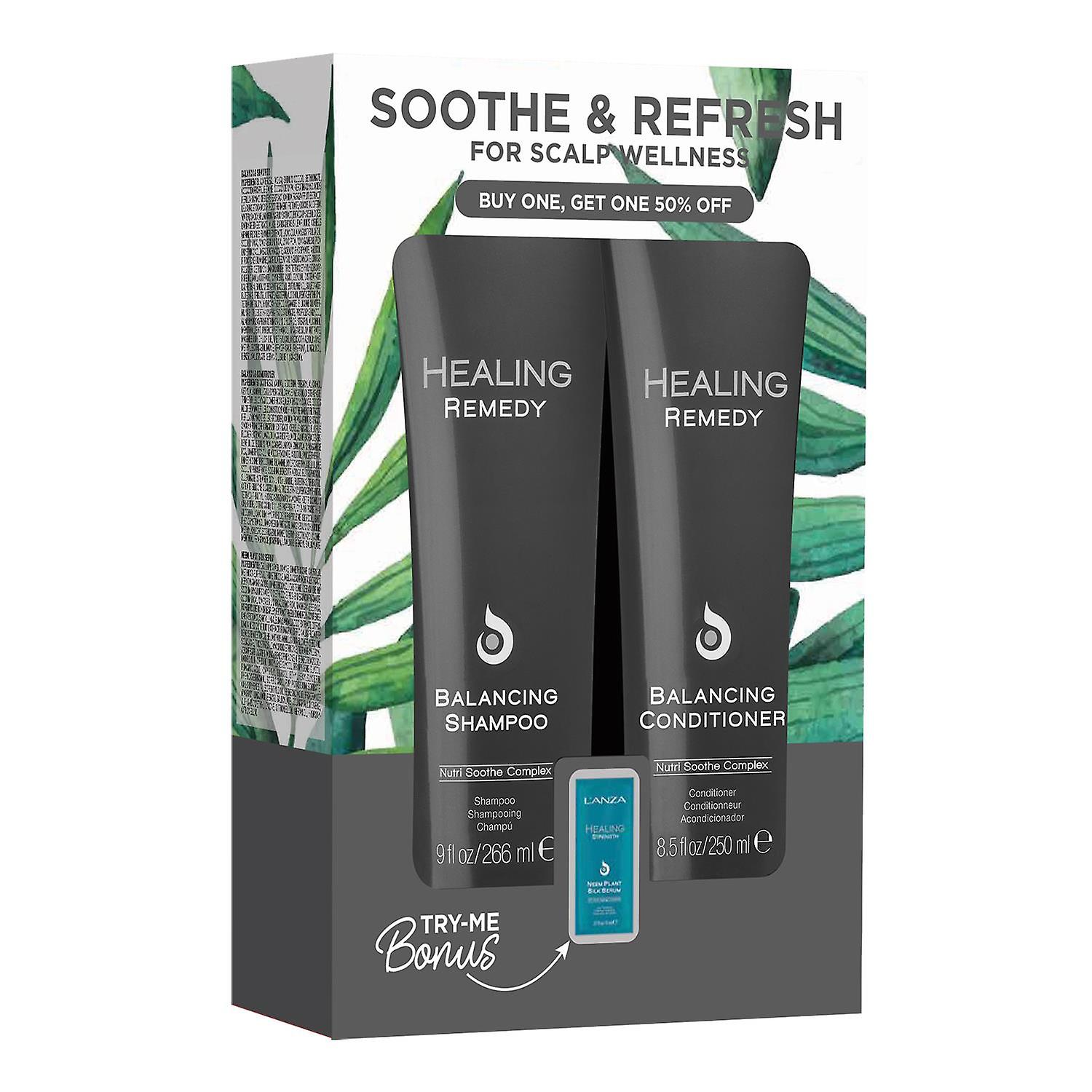 L'Anza Healing Remedy promotional set containing a L'Anza Healing Remedy Scalp Balancing Shampoo 266ml, a L'Anza Healing Remedy Scalp Balancing Conditioner 250ml and a FREE L'Anza Strength Silk Serum 5ml sachet.