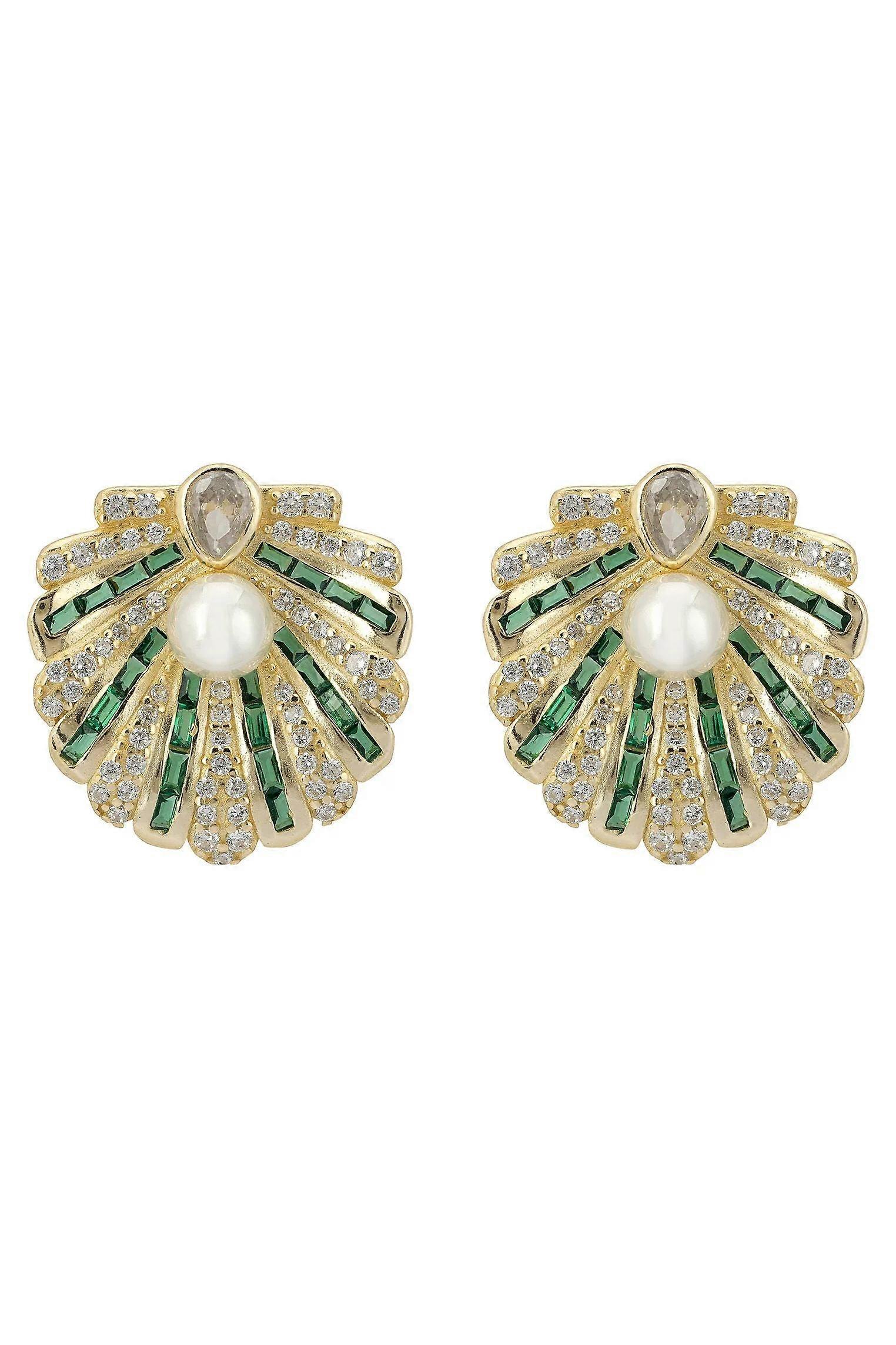 Latelita Art Deco Scallop Shell Earrings for Women: Emerald Green, White, Gold - 925 Sterling Silver with 18k Gold Plating, Cubic Zirconia and White Pearls