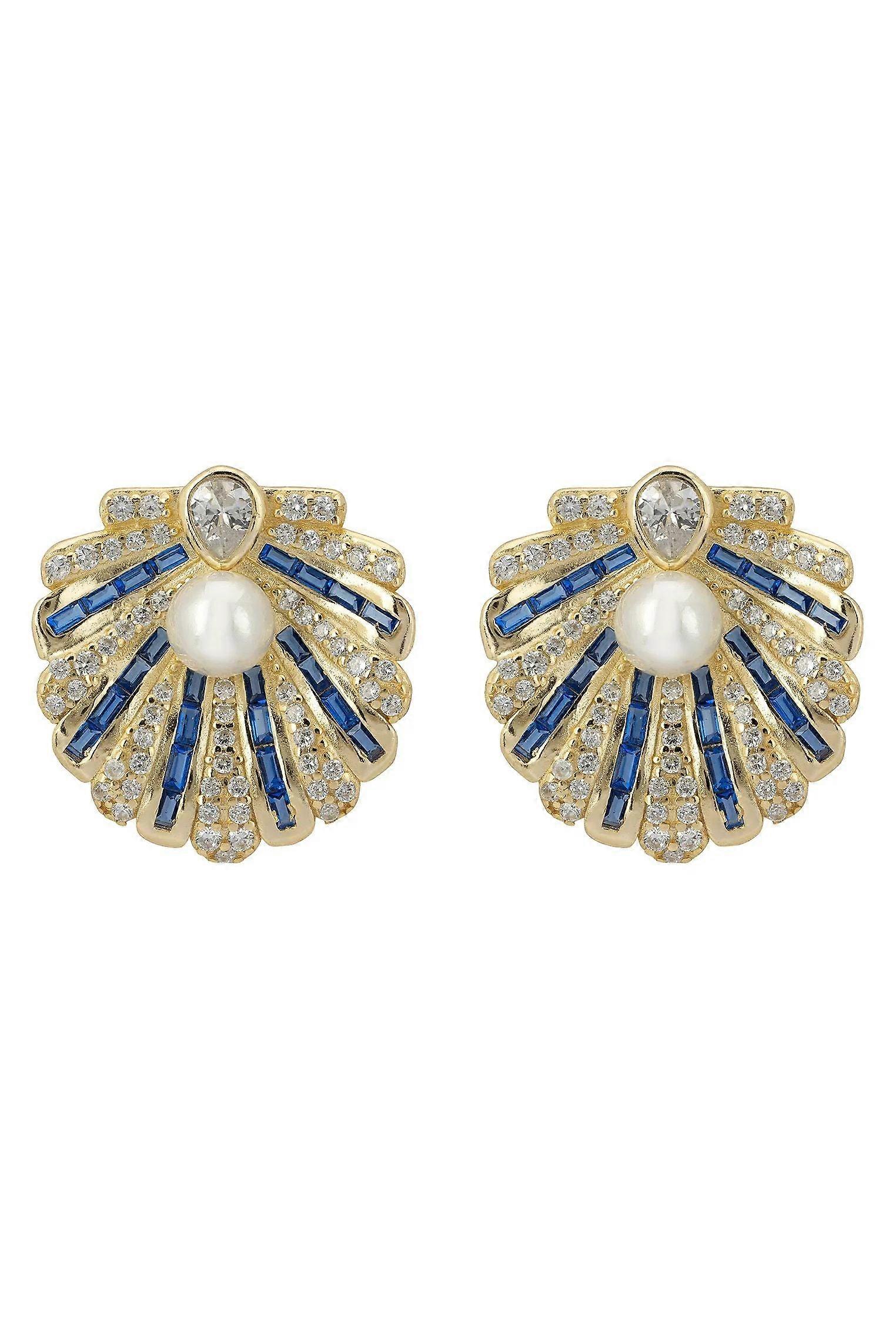 Latelita Art Deco Scallop Shell Earrings for Women: Sapphire Blue, 18ct Gold, White Pearls and Cubic Zirconia