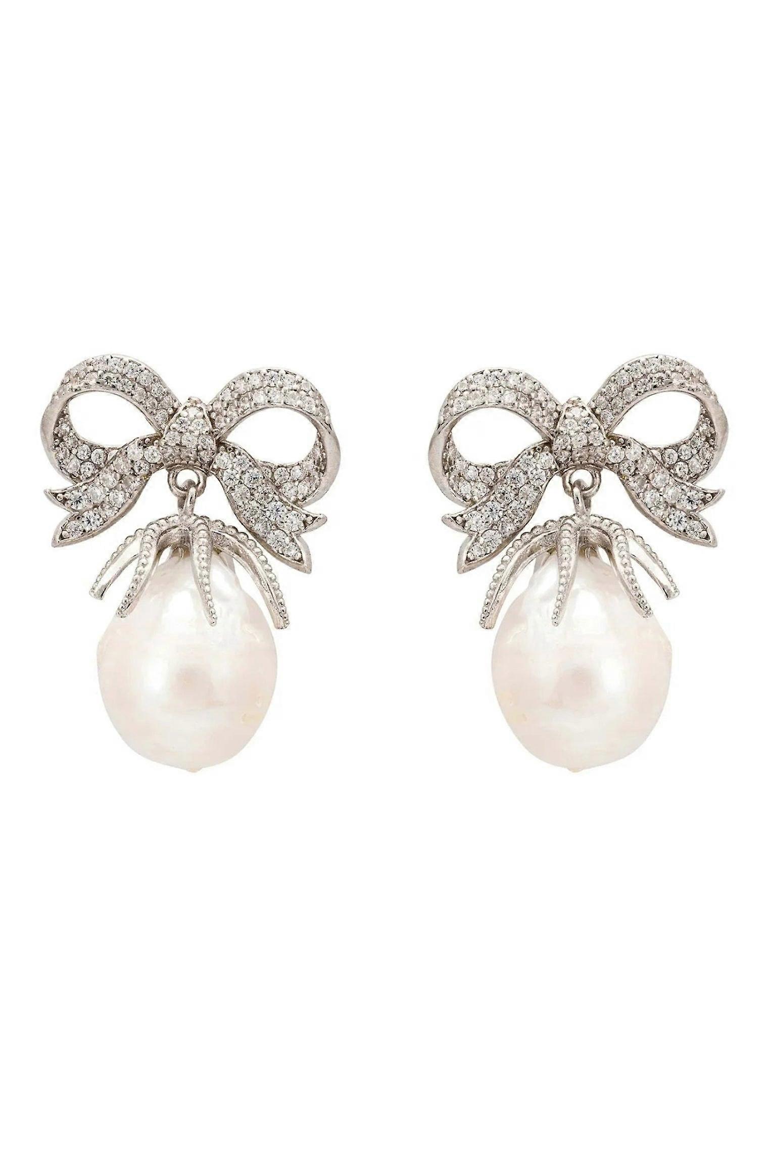 Latelita Baroque Pearl Ribbon and Bows Drop Earrings - 925 Sterling Silver, Cubic Zirconia Accents, Size: N/A