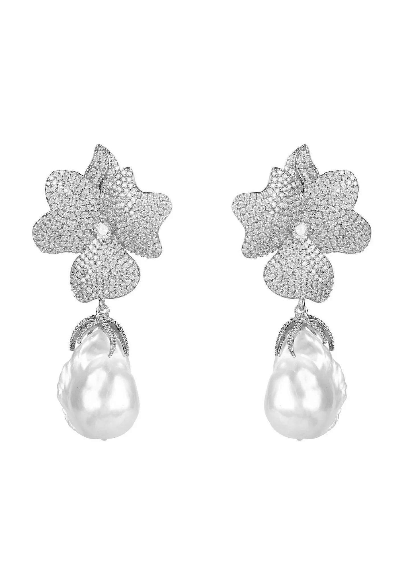 Latelita Baroque Pearl White Flower Drop Earrings, 925 Sterling Silver, Size: 5.5cm x 3cm