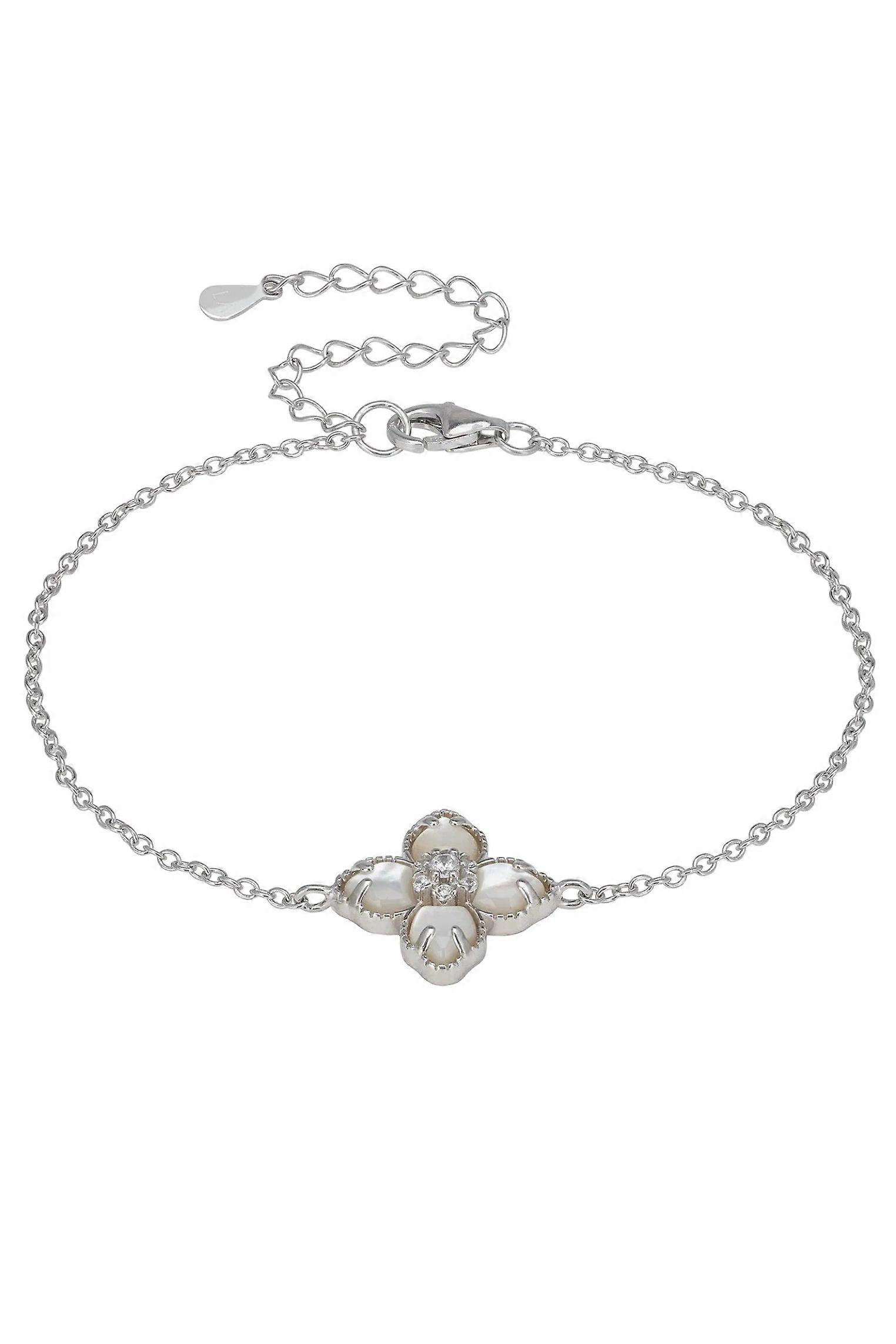Latelita Flower Clover Mother Of Pearl Bracelet Silver for Women - 925 Sterling Silver - Adjustable Chain - Cubic Zirconia Accent
