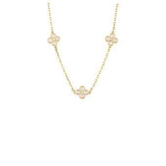 The Flower Clover Triple Choker Necklace is the perfect addition to your jewellery collection. With its chic and elegant design, this necklace adds a subtle but beautiful look to any outfit.Featuring three flower clover motifs of white Cubic Zirconia stones spaced along a the front aspect of a 22ct gold plated chain, it's the perfect piece for any occasion, from weddings to everyday wear and everything in between!This 925 sterling silver, gold plated necklace is finished with a lobster clasp, for added security, and has an adjustable length of 40-45cm. Plus, the 0.9 cm flower motifs add just the right amount of sparkle to complete the look and it weighs a comfortable 3 grams.If you're looking for a fashionable and timeless way to show off your unique style, then this necklace is for you. And why not make it even better by pairing it with our Flower Clover Drop Earrings and Flower Clover Triple Bracelet? Shop now and elevate your style!