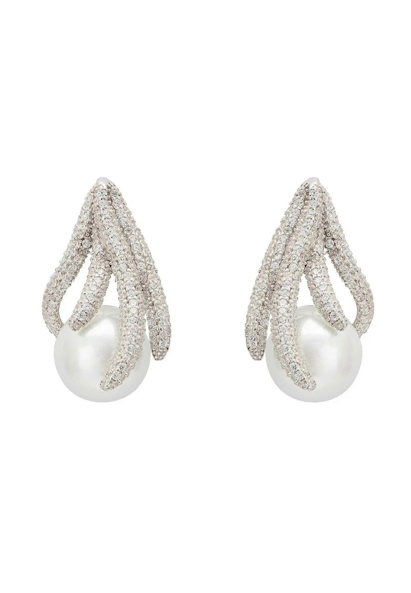 Latelita Moonlit Embrace Pearl Earrings in Silver - 925 Sterling Silver Earrings with Cubic Zirconia Tendrils and Pearl - Size: Unknown