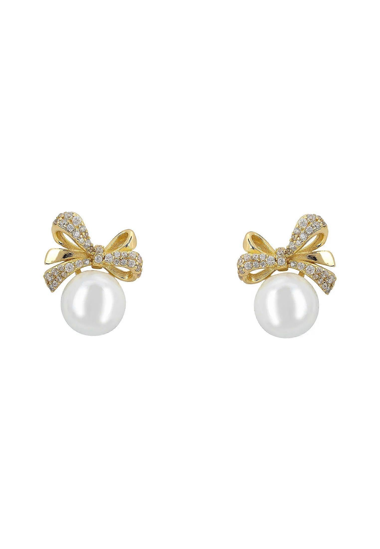 Latelita Ribbon Bow Pearl Stud Earrings in Gold - 925 Sterling Silver with Cubic Zirconia and Majorica Pearl