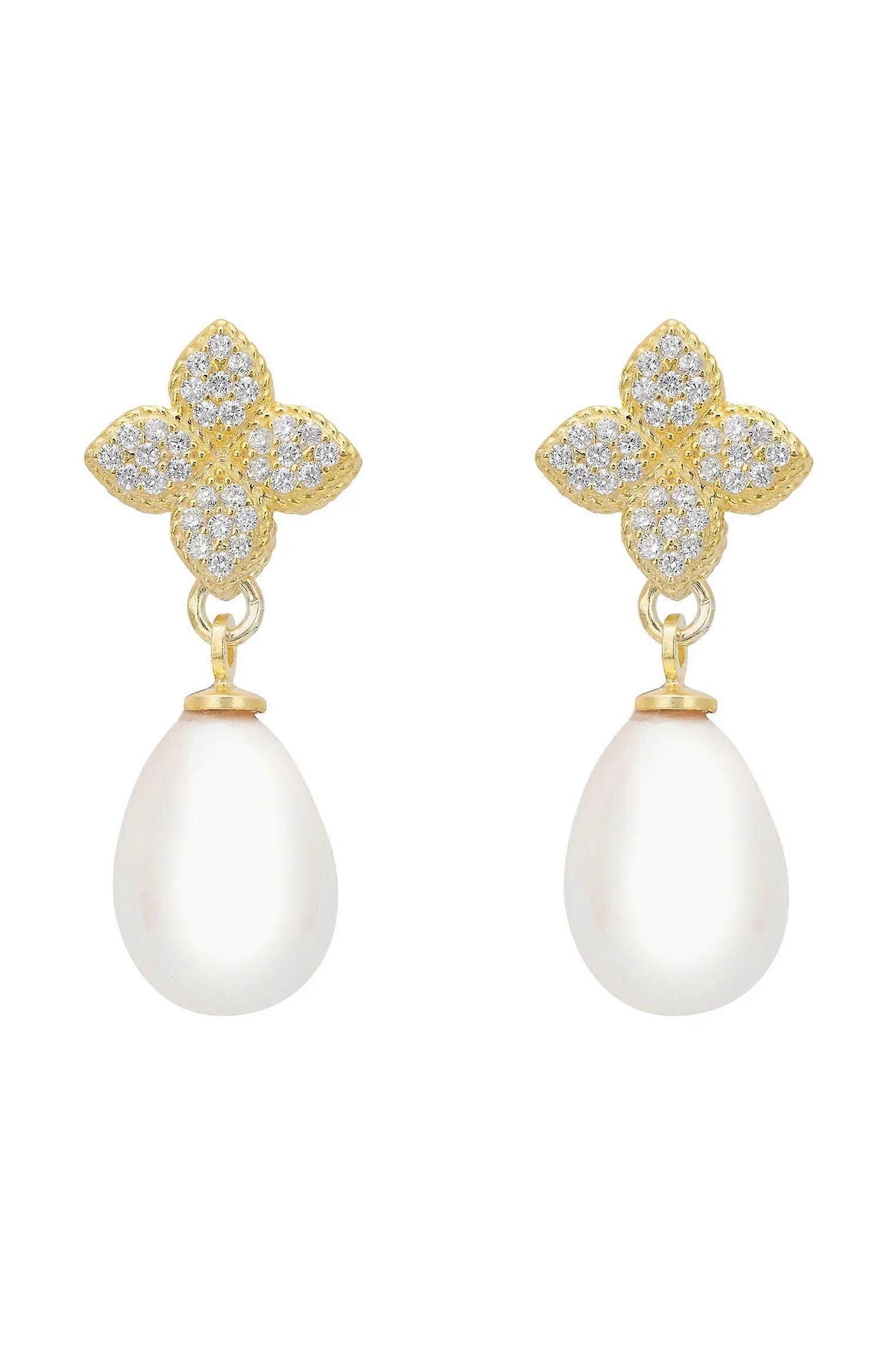 Latelita Sterling Silver and 18ct Gold Plated Clover Flower Pearl Drop CZ Earrings for Women