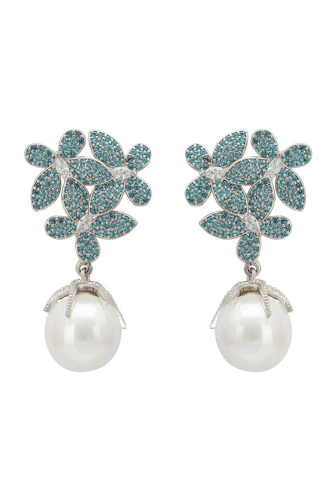 Latelita Women's 925 Sterling Silver Aqua Blue Flower Earrings with Cubic Zirconia and Pearl - 3.5cm