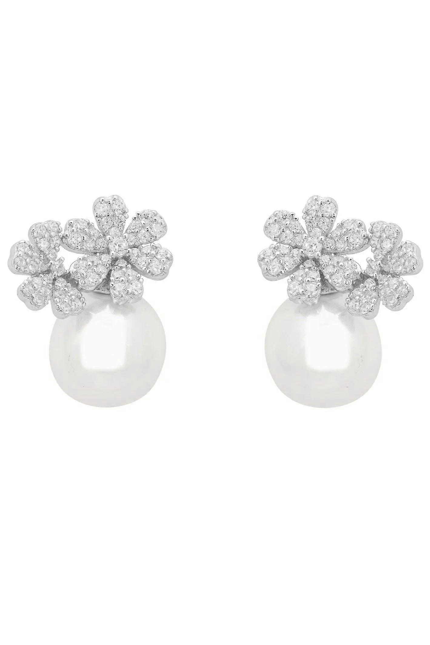 Latelita Women's 925 Sterling Silver Bouquet and Pearl Stud Earrings with Cubic Zirconia - Length 1.7cm, Width 1.4cm