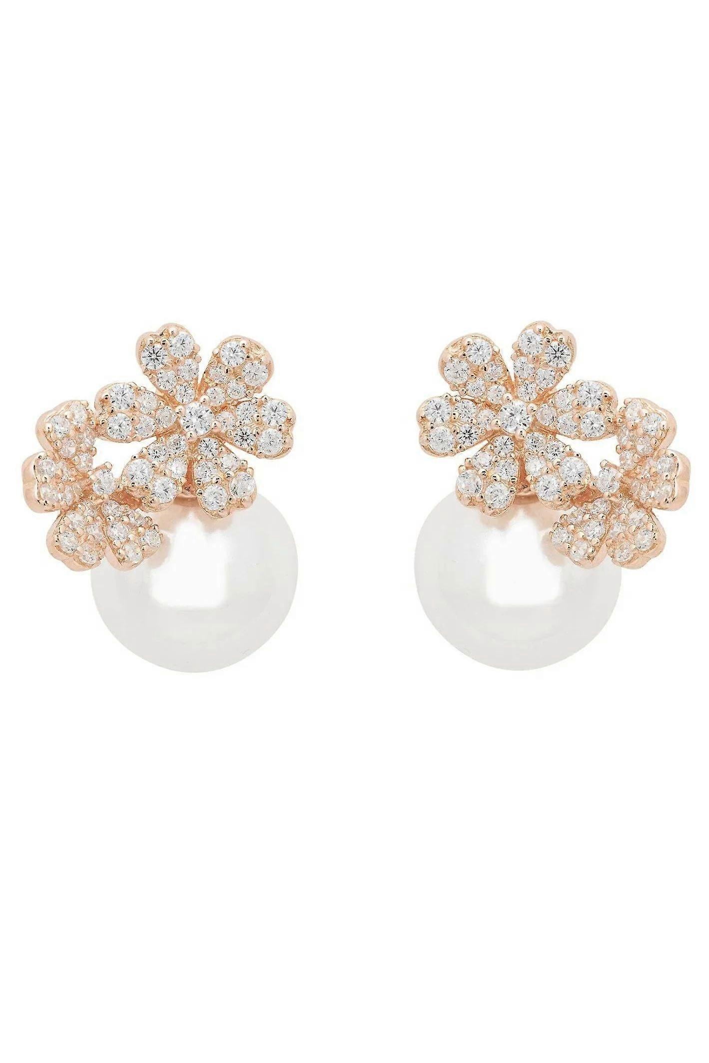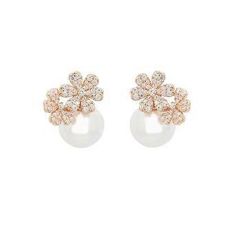 Latelita Women's 925 Sterling Silver Rosegold Dipped Stud Earrings with Pearl and Cubic Zirconia - Design: Floral Motif with Sparkling Stones