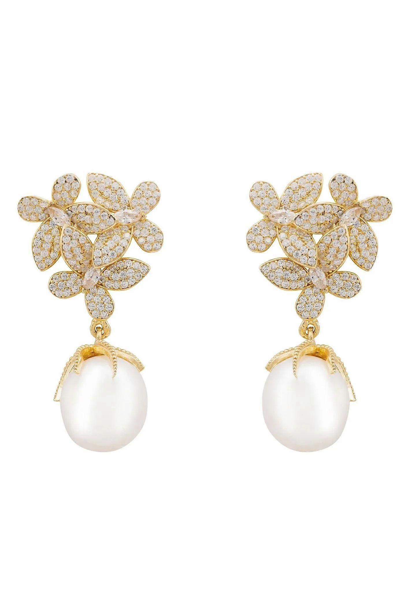 Latelita Women's Gold-Dipped 925 Sterling Silver Flowers Pearl Earrings with Cubic Zirconia and Pearl - 3.5cm x 1.9cm