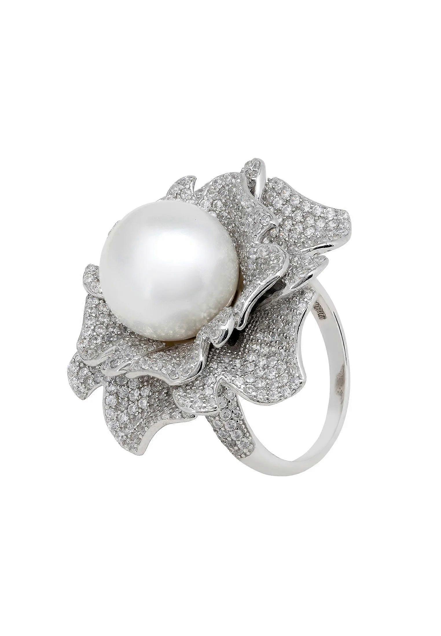 Latelita Women's Sterling Silver Pearl and Rose Petals Cocktail Ring with Zircons
