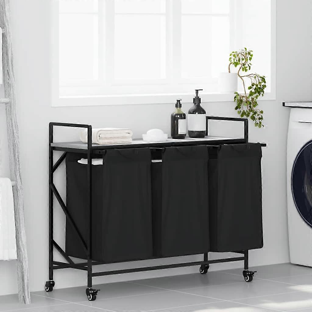 Der Wäschekorb bietet eine geräumige und praktische Aufbewahrungslösung mit ausziehbaren Wäschesäcken und Rollen, die das Ordnen und Transportieren Ihrer Wäsche mühelos machen. Wäschesortierer: Dieser Wäschesortierer bietet Platz für eine großzügige Wäscheladung pro Wäschesack und hilft, Kleidungsstücke nach Farbe oder Stoffart zu sortieren, für einen aufgeräumten Wäschebereich zu sorgen und auch Spielzeug und mehr aufzubewahren.Praktische ausziehbare Wäschesäcke: Die herausnehmbaren Wäschesäcke sind mit ausziehbaren Griffen und Klettverschlüssen zum einfachen Abnehmen und Herausziehen ausgestattet. Die verstärkten Bodenplatten helfen, die Form der Säcke zu erhalten und ein Durchhängen zu verhindern.Robuste und langlebige Struktur: Dieser Wäschekorb kombiniert einen Stahlrahmen mit langlebigem Holzwerkstoff und bietet so hervorragende Festigkeit, Verschleißfestigkeit und Stabilität.Obere Ablagefläche: Der Wäschekorb verfügt über ein oberes Regal und bietet so eine praktische Lösung, um Ihre wichtigsten Dinge griffbereit zu haben. Perfekt zur Aufbewahrung von Toilettenartikeln, Waschmitteln, Weichspülern oder sogar Dekorationsartikeln.Mühelose Mobilität: Dank robuster Räder lässt sich dieser Wäschekorb problemlos von Raum zu Raum rollen. Zwei der Räder sind mit Bremsen ausgestattet, sodass der Korb, sobald Sie ihn an der gewünschten Stelle platziert haben, sicher an seinem Platz bleibt und nicht wegrollt. Rahmenfarbe: SchwarzRegalfarbe: Sonoma-GrauWäschesackfarbe: SchwarzRahmenmaterial: StahlRegalmaterial: HolzwerkstoffWäschesackmaterial: Stoff (100 % Polyester)Gesamtmaße: 99 x 33 x 82 cm (B x T x H)Wäschesackmaße (jeweils): 29,5 x 29,5 x 52,5 cm (B x T x H)Maximale Gesamttragkraft: 40 kgMax. Tragkraft pro Regal: 20 kgMax. Tragkraft pro Wäschesack: 5 kgMit vier Rädern (zwei mit Bremsen)Jeder Wäschesack verfügt über eine Bodenplatte für mehr StabilitätZusammenbau erforderlich: JaLieferumfang:3 x Wäschesack3 x Bodenplatte1 x Regal4 x RäderWäschekorbgestellMontagezubehör