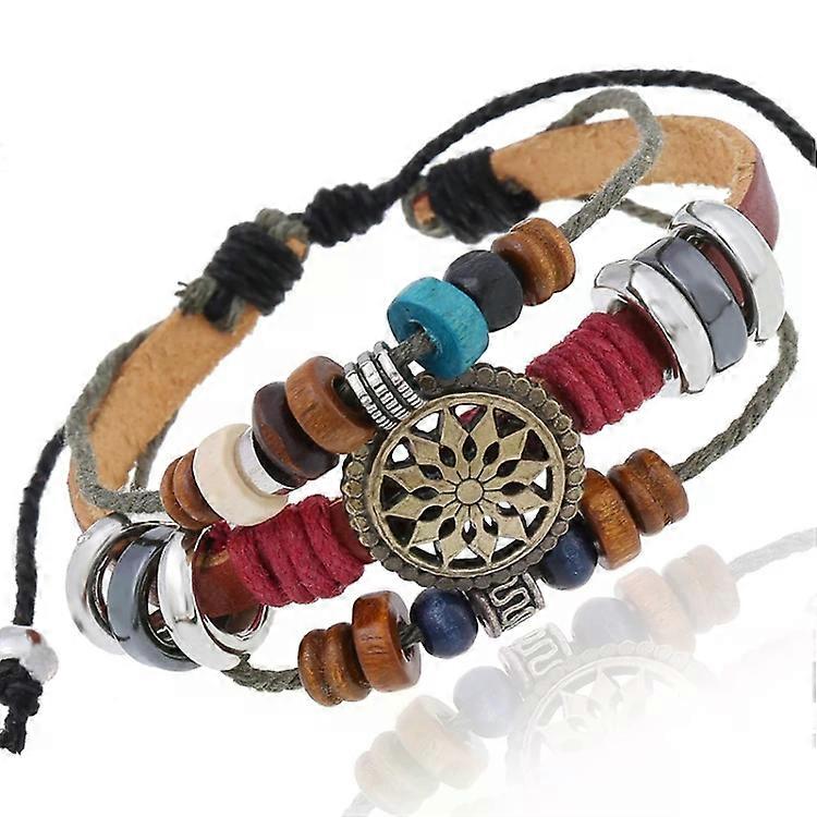 Leather Beaded Bracelet Set-Retro Light Brown & Bronze Accessories-Light Brown Leather+Bronze Accessories