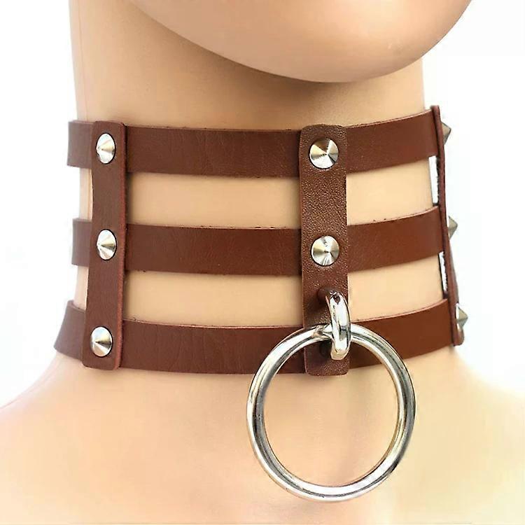 Leather Collar Necklace-3-Row Caged Design,Punk Gothic Rivets,Brown Brown